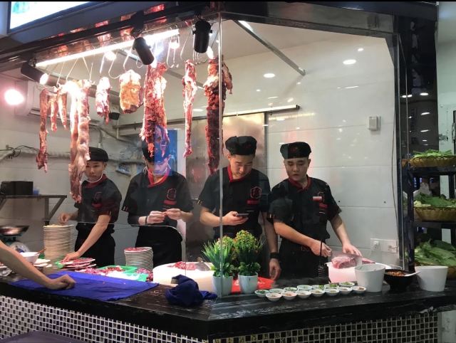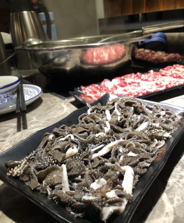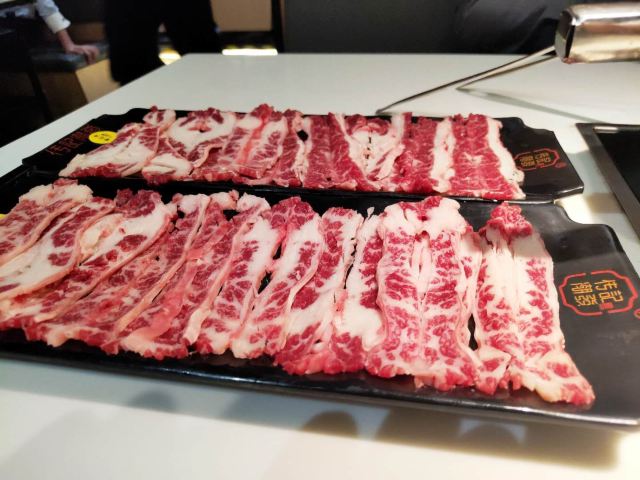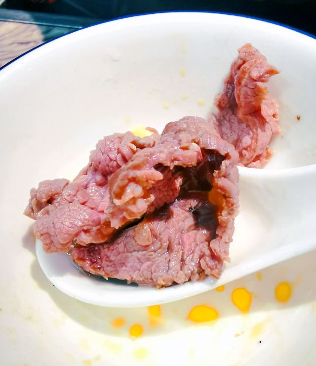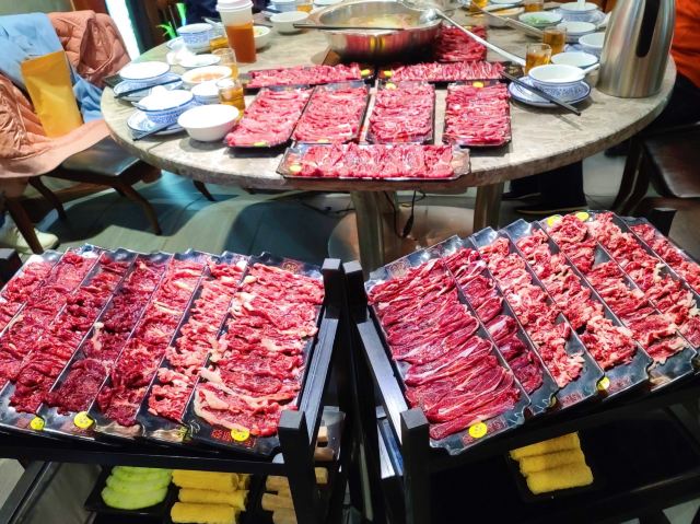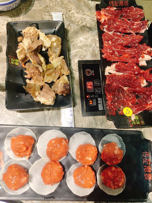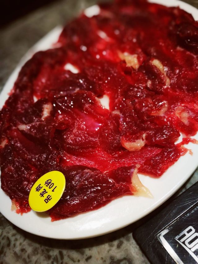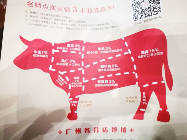 陌染MM有亲戚请吃饭,选择了这一家牛肉火锅店,主要的原因是离地铁站非常近,它就在地铁六号线团一大广场站,某一个出口一出来就见到了,虽然那个地头不是很旺,但是近地铁站,还是很好很方便的。它有三层楼,楼梯比较陡,上下要小心一点,一楼和二楼都是卡座为主,三楼就有圆桌,服务员们和厨房的工作人员都是说潮汕话的,对于潮汕人来说,肯定会很亲切。 由于是亲戚点的菜,亲戚埋的单,所以我也不知道这里的价位,只是瞄了一下,见到某些肉是28元一碟,那也就是“均”价了,还有路边的大玻璃上也写着有88元套餐,包括的食物挺多的。这里的肉不错,牛肉丸子也弹牙,感觉总体的出品很好。肉有分很多种,有牛肉、肥牛、胸口油、五花肉等等,一时想不起太多。每一碟肉都是切得非常薄,薄薄的一片片平铺在碟子上,其实一份肉真的没有多少。在一楼的角落,有一个大玻璃屋厨房,他们就是在那里现场切肉、铺碟子,大家可以随时看到里面的情况。 打火锅的锅子不大,对于我们坐圆桌子的一大桌客人来说,大家都冲着那一个小锅子行动,未免小了一点,建议不同大小的桌子配不同大小的锅子。酱料是自助的,除了在每一张桌子上放了一瓶辣椒酱和一瓶沙茶酱以外,每一层楼也有酱料自助区,有酱油、蒜茸、葱茸、辣椒粒等等供应。