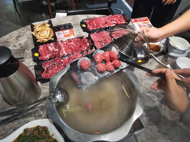 吊龙肉 经典的吊龙,瘦而不柴,入口奶香迸发,软嫩,鲜到掉眉毛,沾上特制的沙茶酱,简直太喜欢了! 鲜牛丸 谁懂新鲜牛肉丸的含金量,Q弹有嚼劲,完全可以拿来当乒乓球,这样的牛肉丸好正,咬下去。直接爆汁! 匙仁肉 这个部位的牛肉,也很脆嫩,好吃! 沙茶酱 吃牛肉火锅搭配沙茶酱绝了! ⭐服务员服务态度也很好,个个是"涮肉计时器" 生怕你错过0.1秒的巅峰口感!这里很适合朋友聚餐,情侣约会,家庭聚会,聚餐首选!冲冲冲!