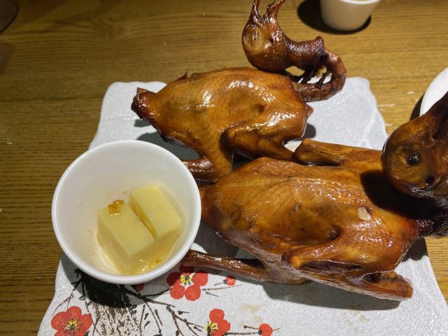 陌染MM团购了一毛钱的乳鸽券来到这里,本来是想要到北京路店的,那边等位实在是厉害,想想还是过来这一家分店了。地铁五号线到动物园南门站,A出口出来向前走一点,基本上就可以见到了,某肠粉连锁店的楼上。这里的装修比较古色古香,环境还是蛮不错的,最好的我感觉是服务,从咨客开始,我们来到的时候还是需要等位,然后咨客就一直向我们端茶水过来,还有免费的零食提供。等位超过一定时间也是有送菜品的,一共有三档,大家可以留意一下。 {红烧乳鸽},原只上,这里的任何乳鸽都是原只上,然后马上就有服务员去到你的身边,问需要帮你剪开鸽子吗,可以一开二,一开四和一开六,也可以原只自己手撕。鸽子一剪开就马上流汁,香味扑鼻而来,香喷喷的乳鸽特别吸引人。我们一共吃了三只鸽子,两只红烧,一只盐焗。 {盐焗乳鸽},盐焗的鸽子同样推荐,个头和红烧的一样大,味道不一样,盐焗的味道很入味,鸽肉入味,就连骨头都很香。 {咸鱼茄子煲},非常好吃,这里的做法基本上和其他餐厅的一样,只是这里的颜色看起来没有那么深,我觉得这样好些,因为颜色太深也就是调味料太重,太咸了。茄子很嫩,没有吝啬咸鱼,我一个人就吃到不少,热乎乎的时候特别送饭。 喜欢这里送的小吃,三款小吃拼盘,分别有黄瓜、芥末海蜇和桂花莲藕,每一份乳鸽那里也配了两块桂花绿豆糕。