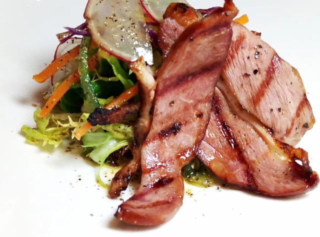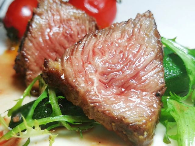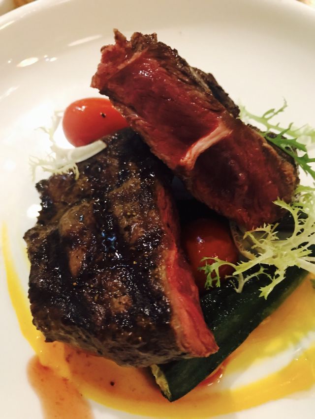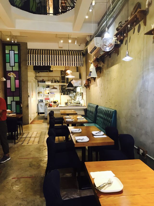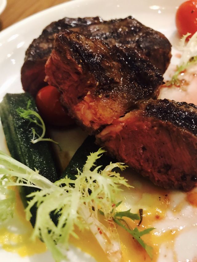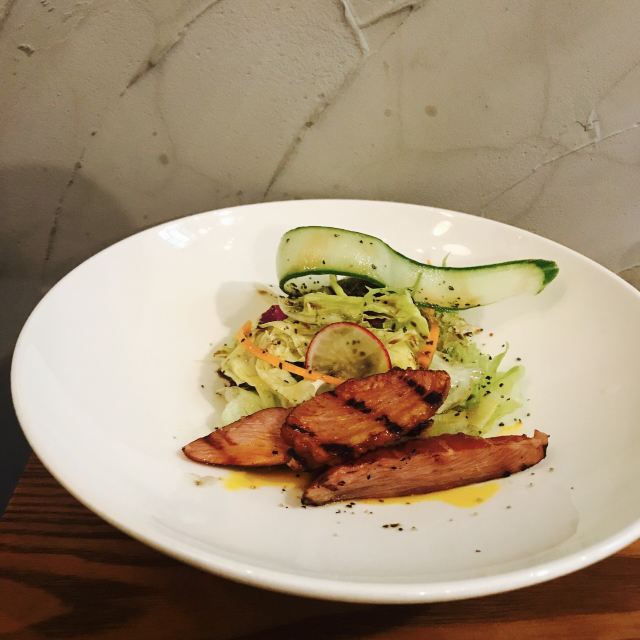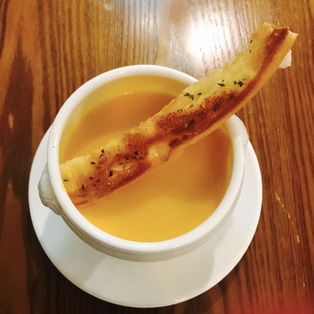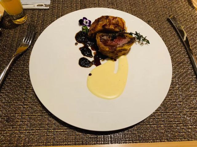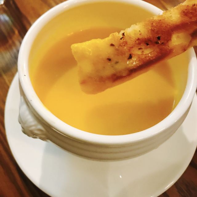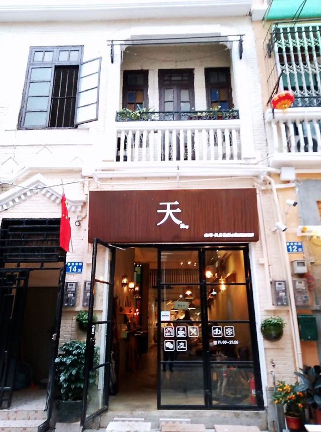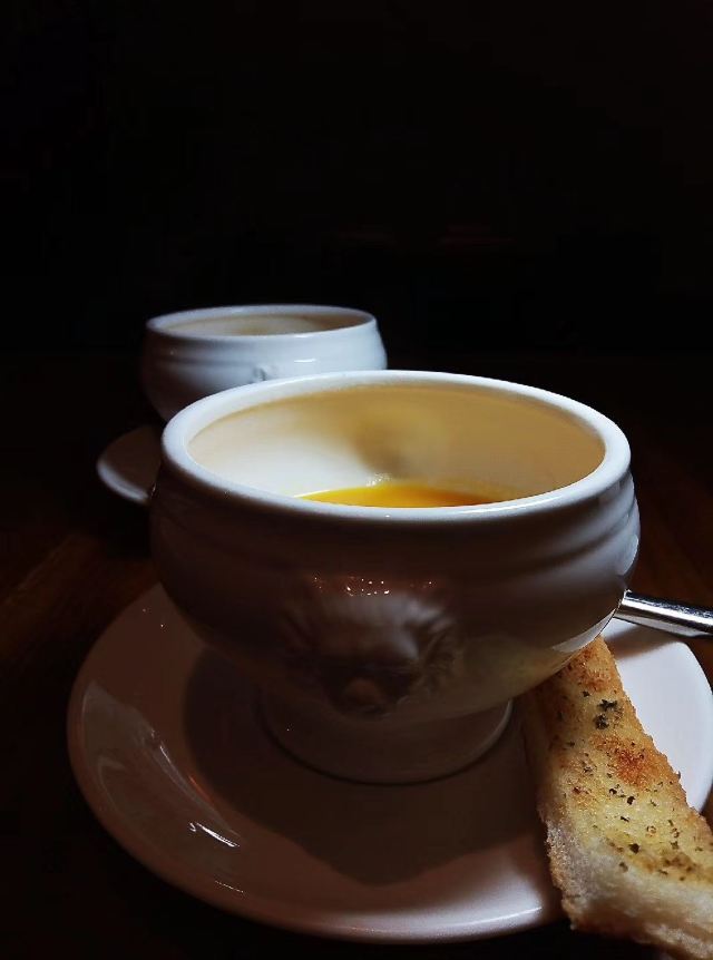隐藏在闹市中的扒房, 在车水马龙的中山六路,两旁的骑楼,后面穿插着不少小巷子。 其中就有着这么一家天咖啡扒房。 一楼是开放式厨房,二楼是用餐区。 南瓜汤配蒜香法包,淡淡的南瓜汤刚好与香脆法包形成对比,又不会抢味。 烤烟鸭胸沙拉,开胃的沙拉醋,为后面吃牛扒作准备, 加拿大牛板腱,建议五成熟,还可以看到部分血水,嫩嫩的牛肉,稍微蘸着盐就好了,不用其他调味料,这样更好地保留了肉质的鲜嫩。