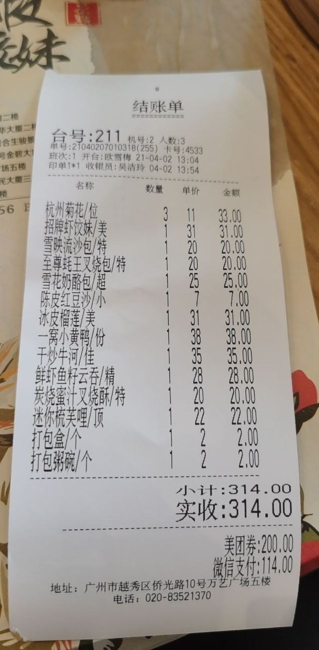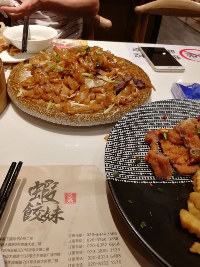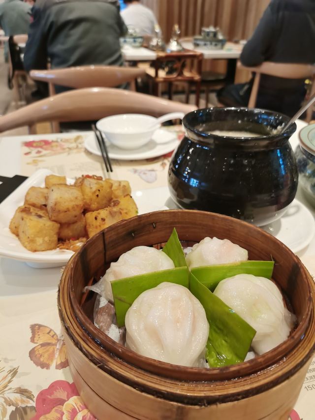 肥猫天来广州第一天早茶去了点都德,结果好失望!评分高不代表味道好!第二家就来了虾饺妹,中午11点40到的,好多人哦!排队排了半个小时,终于到我们了,心想这么多老广人排队都要吃的肯定味道差不了。抱着品尝美食的心情点了很多小吃,果真没有让我失望,简直不要太好吃了吧!比北京的金鼎轩强千倍,比点都德好吃的太多了!尤其是干炒牛河太好吃了,份量很足味道老赞了!招牌虾饺全是大虾,滑嫩透明肠皮包裹着满满的虾肉并包裹着汤汁,简直美味鲜香!椰蓉流沙包绝了!一口爆浆流沙喷满嘴,差点被烫死哈哈,好吃极了!雪花奶酪包很好吃不错,冰皮榴莲咬下去满嘴冰爽榴莲迸发而出,软绵绵的像棉花糖,好吃极了!这是一家值得二刷的美食店!超出预期!超满意!