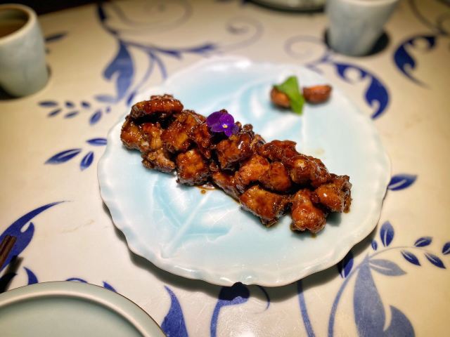 戴维斯是我开在高德置地冬商场的这家江浙菜馆,在上次去table吃早午餐时经过,被它家的环境吸引 ,就想一探究竟,这次终于成行。 中式的装修风格,小桥流水凉亭齐备,转角处还不忘置株桃花,很是适合穿着汉服来用餐呢 ,正说完,看到小妹穿着简洁的古风服饰出现,浅浅柔柔的声调让我们瞬间穿越。 二个人四道菜,最值得推荐就是招积茄子,外脆内嫩肥厚肉多,一道素菜居然吃出了肉肉的 质感,相当了得,从食材到调味到烹饪手艺都值得一赞,不过上桌要快吃,久置外层就不脆了。 此外,泉水煮阿根廷牛小键,食材也是棒棒哒,汤微辛,很野味,这道菜也是上上之选。 开车来的话消费应该是有减免的,具体忘了,订位时可以顺道问问餐厅。