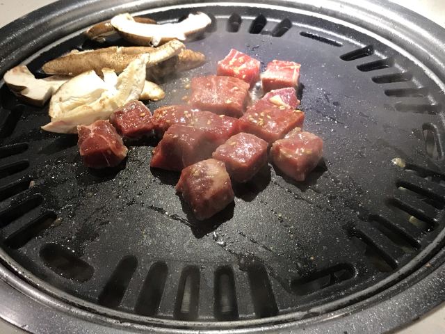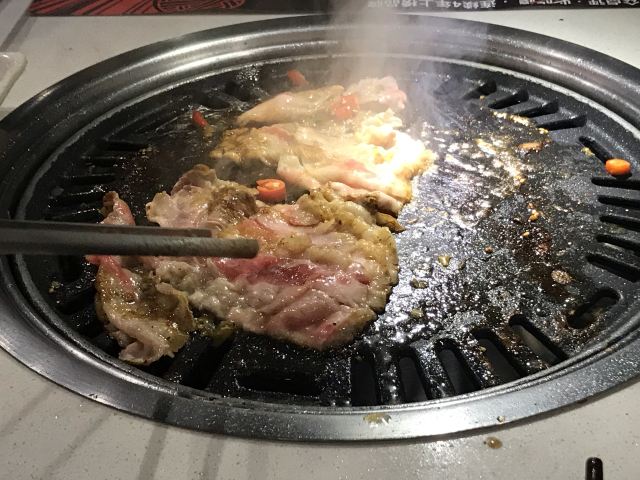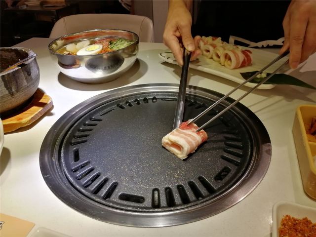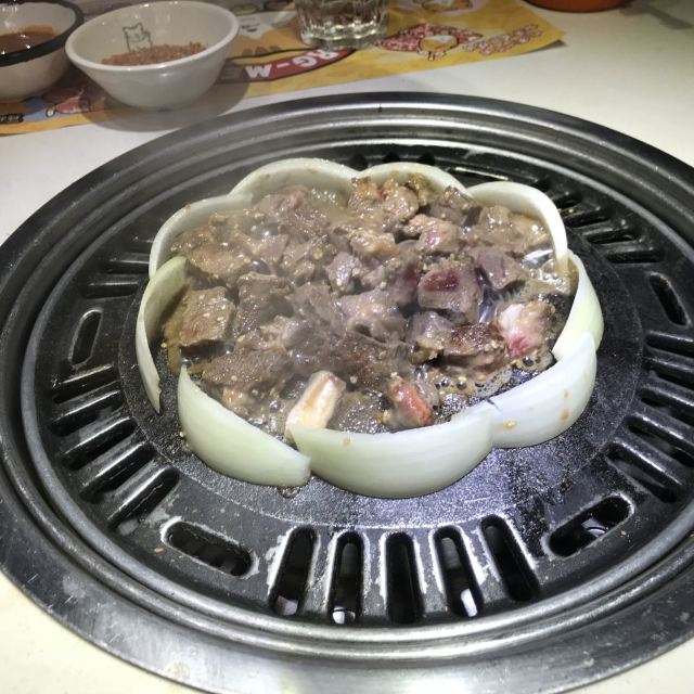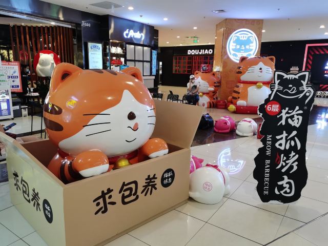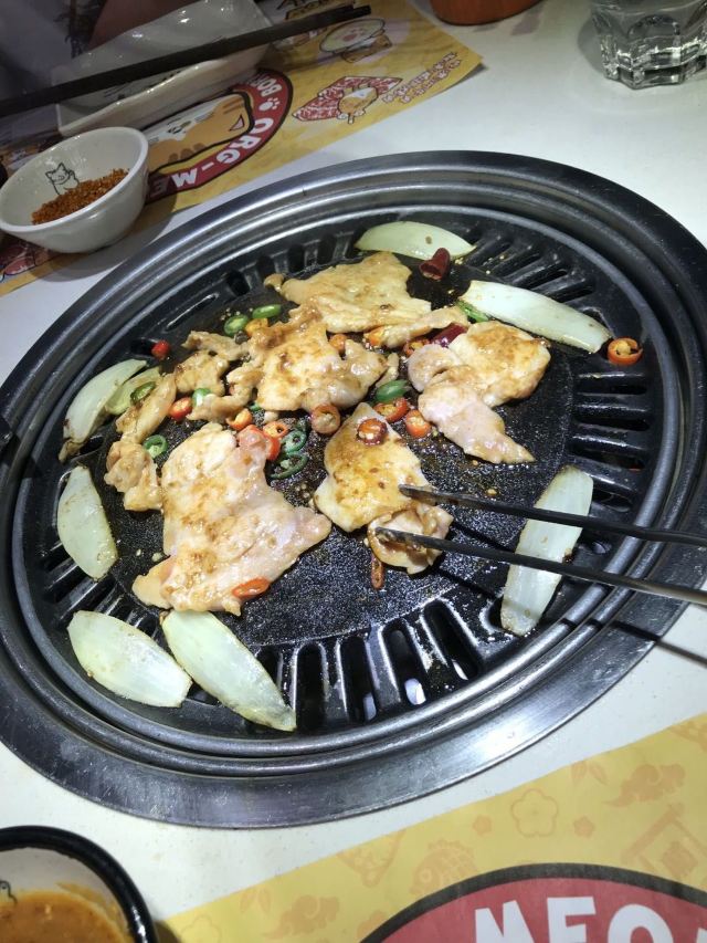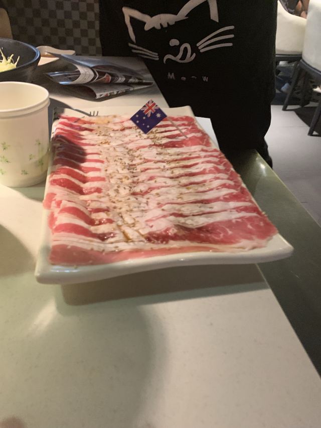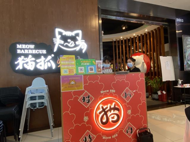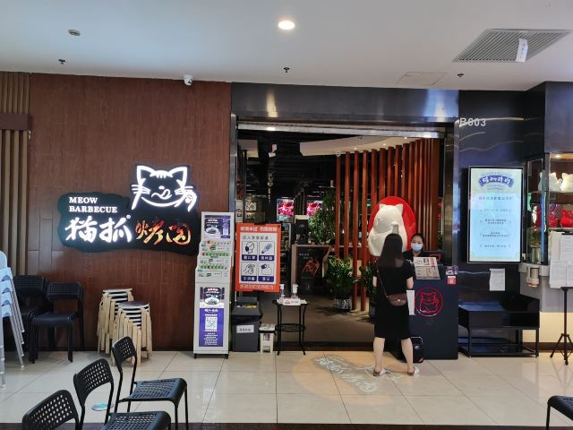 越秀区刚刚恢复了堂食,出来放风,来到了北京路附近的北京路天河城广场六楼,猫抓烤肉以前真是望而止步,每次来到都见到好多好多人在等位,我也不敢等了。现在刚刚恢复堂食,趁着人还是不太多的情况下,提前网上排号了。餐厅的服务态度非常好,全程都有服务员帮我们烤肉,当然如果你想要自己烤,也行,我懒,嘻嘻。 点了四种肉肉,分量还是挺足的,两个人吃的话,建议最好三种肉肉就够了,太多吃不完。服务员烤肉比较专业,什么时候下油,什么时候熟了可以吃,什么时候需要夹起来,以免太老了,服务员都会提醒客人,任何一个服务员路过,见到的都是提醒一下。我们点了{喵星烧肉片}、{澳洲火山牛肉片}、{精品厚切猪五花}和{芝士鸡肉},各有特色。芝士鸡肉,芝士放在一个锡纸的小碗里,直接放煎锅中间加热,使芝士融化,然后鸡肉烤好了以后,蘸着芝士吃,好像韩国的芝士火锅那样。 厚切猪五花也不错,五花肉是肥瘦相间的,厚切也不算太厚,只可以说是刚好,五花肉烤好了以后,油脂渗出,夹一点椰菜丝一起吃,可以解解腻,但是吃起来也非常甘香,停不下来。 餐厅用餐有免费的小菜赠送,一共是四种东西,我那天是凉拌豆芽菜、豆皮、洋葱丝和煮花生,很喜欢吃花生,还可以免费继续添加,不错。