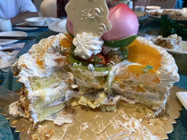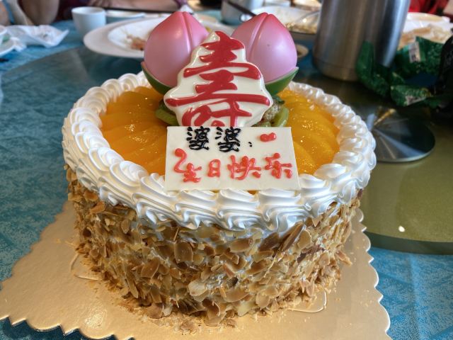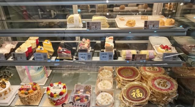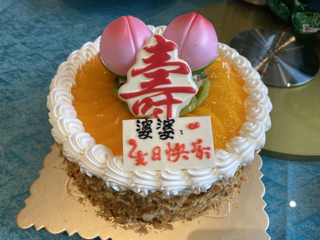 那天突然间要买个蛋糕,打电话来这里碰碰运气,没有想到他们可以现做蛋糕,一个小时就可以取了,非常方便。买的是两磅的寿蛋糕,蛋糕吃得出来非常新鲜,很松软,忌廉很滑,一点都不腻,蛋糕中间有夹水果,表面也是满满的黄桃和新鲜的奇异果,还有装饰,老人家很高兴呢。而且价格不贵,下次还可以再买这家的蛋糕。