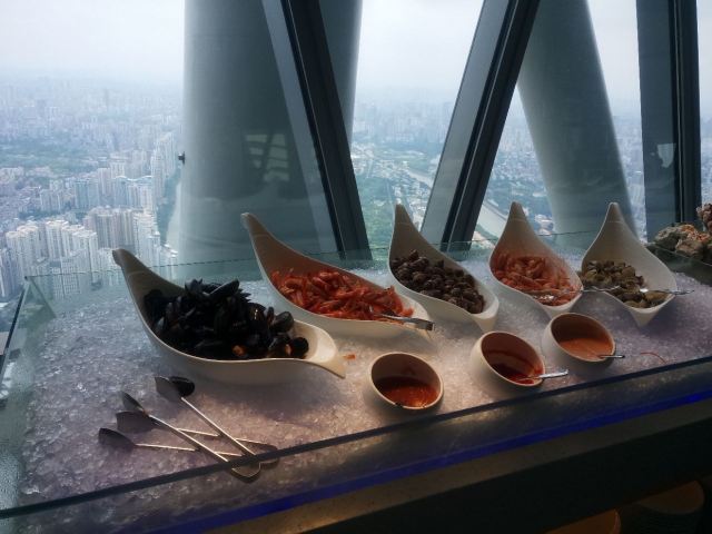 Ganton Tower TWIST Mediterranean Buffet Revolving Restaurant我生日的时候男朋友带我去的餐厅,总体来说还是很精致的。这家餐厅是慢慢的旋转的,你能看到周围的环境一点点的变化。 【口味】吃的种类很丰富,有很多国家的菜式可以选,还有一个巨大的龙虾送。 【环境】当然不错,比较高级,而且能看清广州的地貌。但我们去的时候迷雾很多。 【服务】厨师们都很热情。