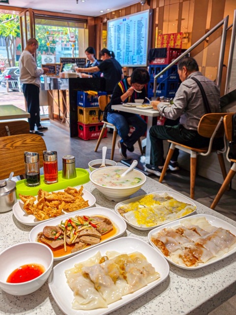 枸杞瘦肉汤,韭王鲜虾肠,白粥,韭菜猪红汤,香滑鱼腩粥,爽滑猪肉肠,柚子茶(冻),港式奶茶(热),柠檬茶(冻),肠粉加蛋