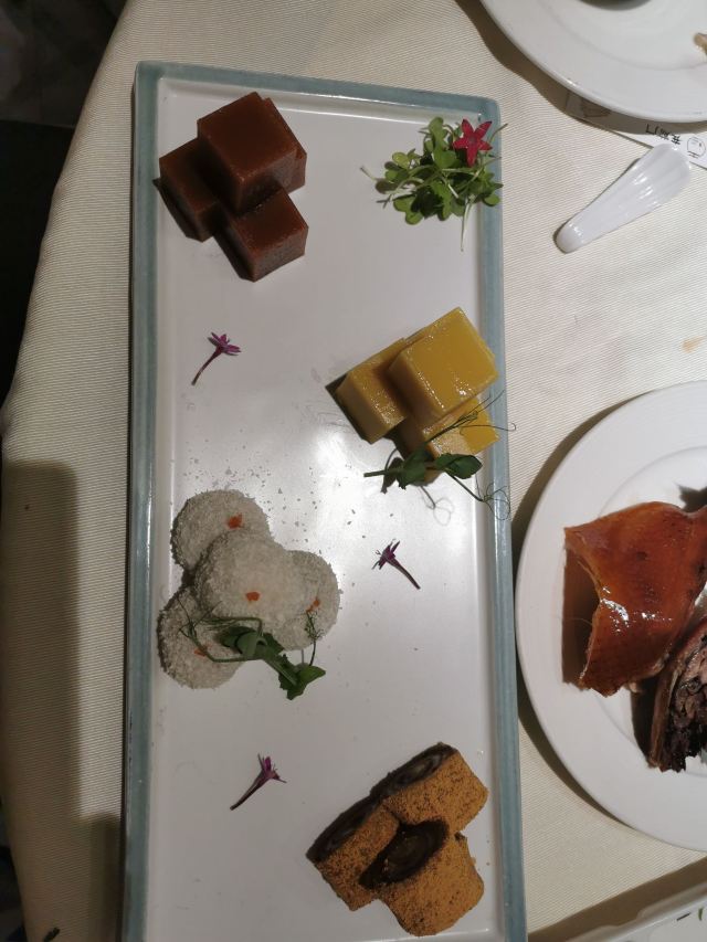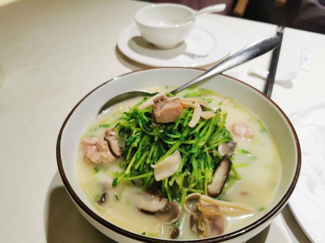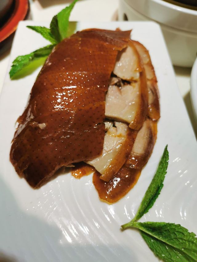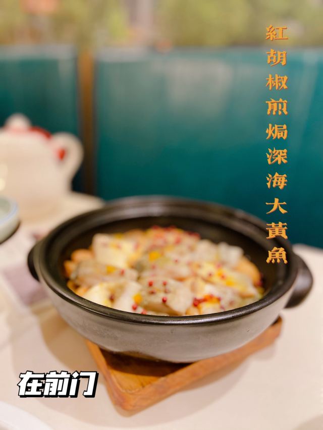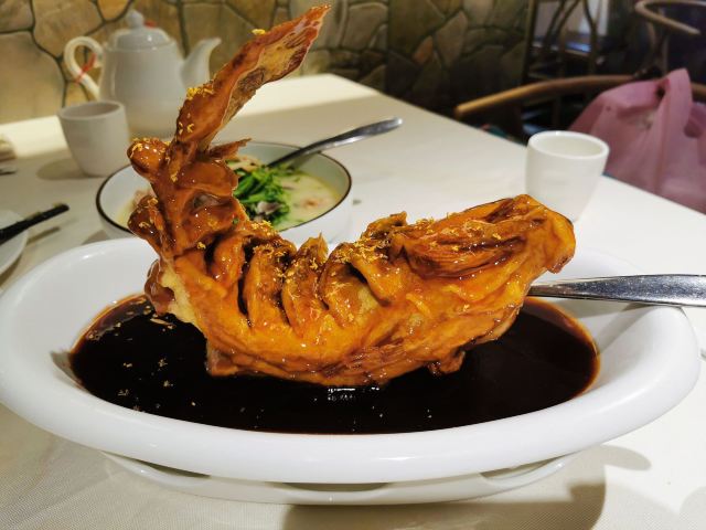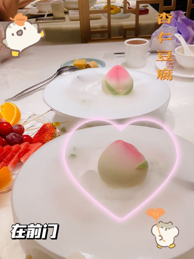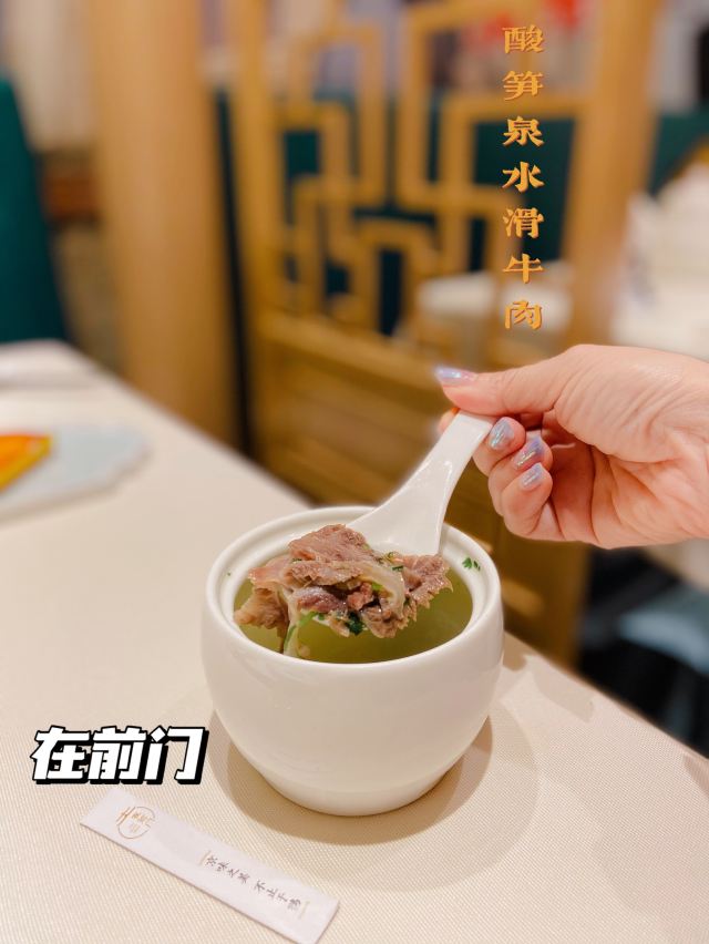 爱旅行的猪仔又来拔草在前门的招牌菜 这家店的出品挺对我的胃的,第一次过来吃了烤鸭觉得棒棒哒,这次过来试试其他招牌菜 糖醋东海大黄鱼 造型如飞鱼,有鱼跃龙门的喜感哦!糖醋鱼的调味不同于粤菜的糖醋鱼,和江浙的醋鱼倒有点类似,偏酸一点,吃这个记得上碗白饭,要不然可能酸得吃不下哦 拔丝芝士榴莲 是我第一次过来就心心念念想吃的东西,不过因为第一次想吃的太多所以没排上。这次过来是必点的了!上来的时候服务员就温馨提醒要尽快吃,要不然就不好拔丝了。摆盘特别漂亮,白砂糖做的雀巢状拔丝绝对是加分项。榴莲的用料也很多,一分钱一分货啦! 鸡汤煮豆苗 的灵魂是鸡汤,泡出来的豆苗味道鲜甜香浓