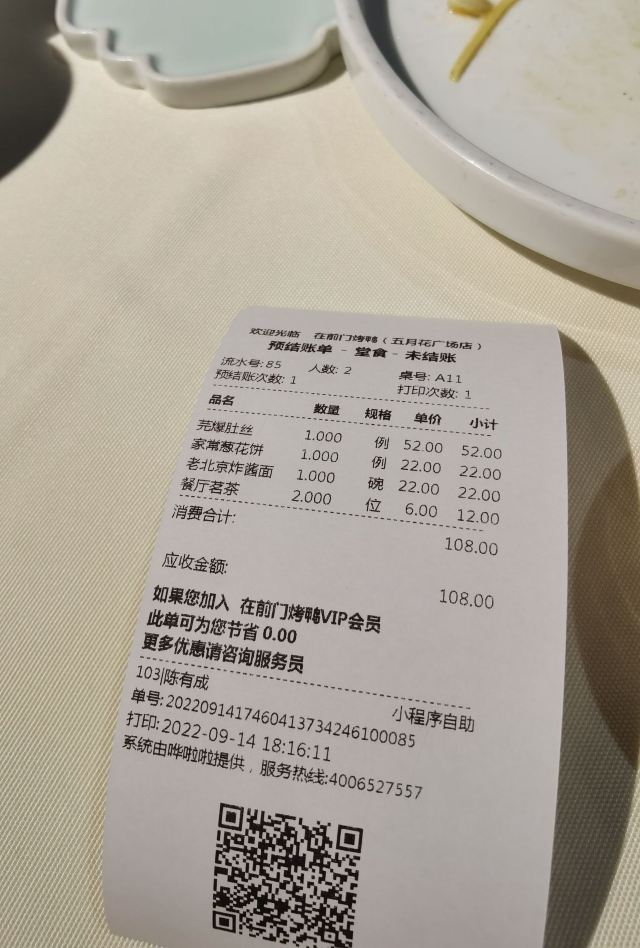 Zaiqianmen · beijingkaoyazhuanmendian周三ZS卡有满减优惠活动(茶位饮料餐巾不参加),过来试试新菜,因为赶时间,我们点了三样比较简单的菜式,扫码点餐加上菜加光盘45分钟搞定👍 【口味】 炸酱面有点太油了,一定配着炸酱吃,否则味道不太够,但炸酱又有点太少了,剩下了一碟油。芫爆肚丝,有牛肚丝白木耳丝加上香菜很好吃,很开胃,推荐。家常葱花饼一般,不够松软,面饼有点实实的确,味道还可以。收藏+打卡送北京老酸奶,好仙啊,浓稠好吃😋