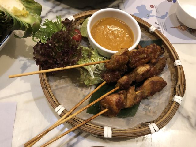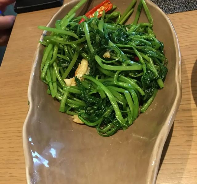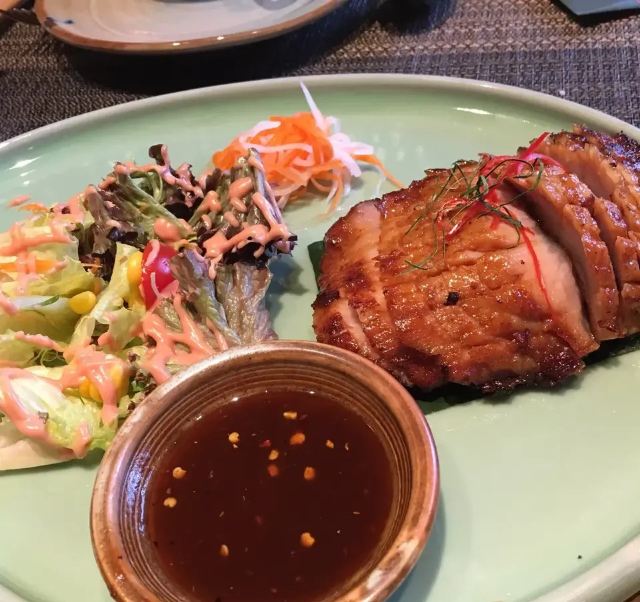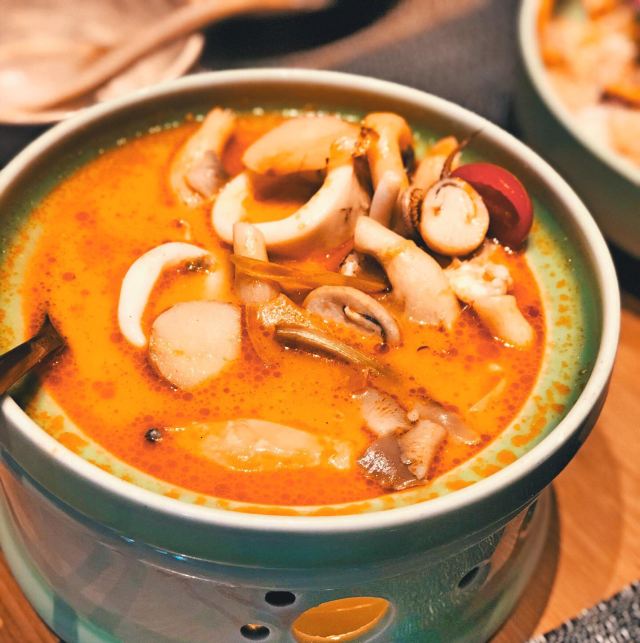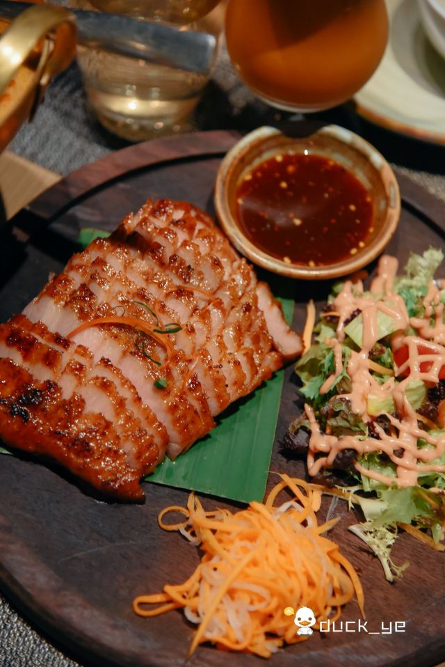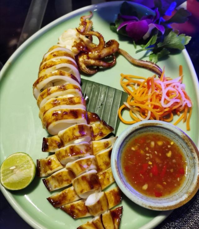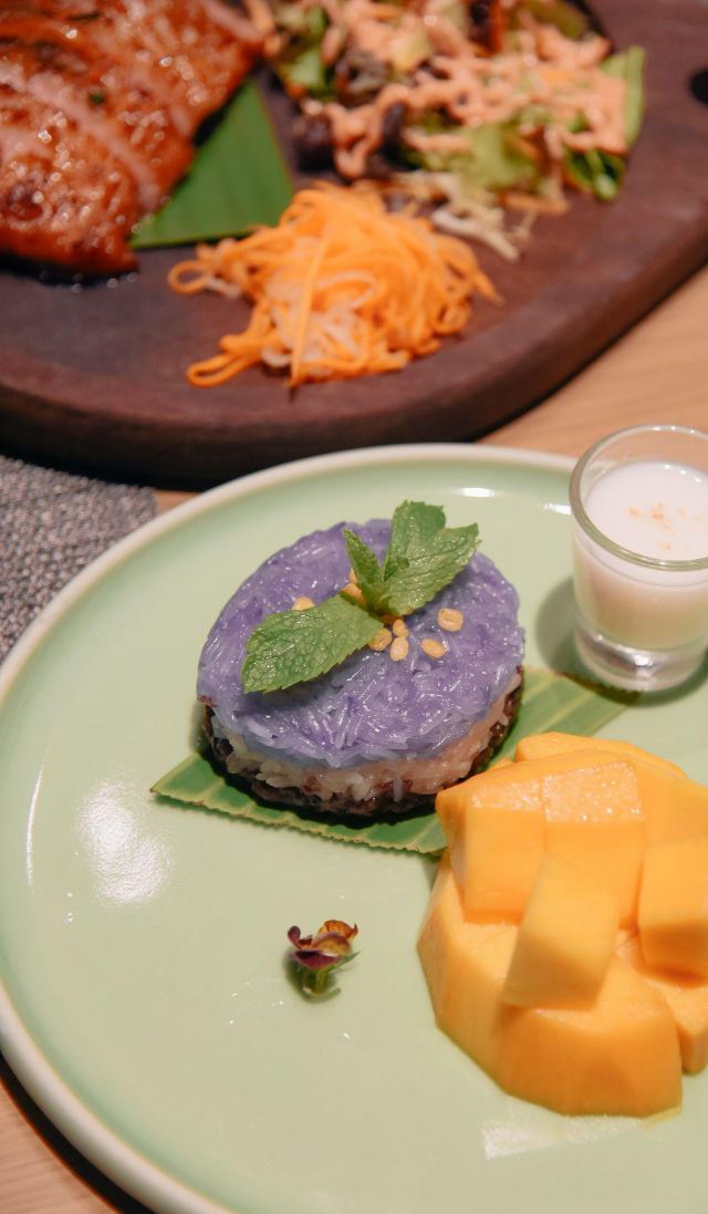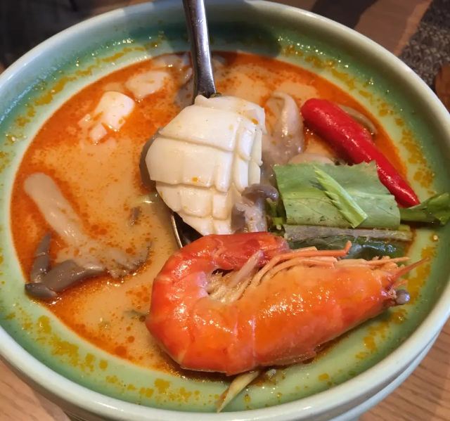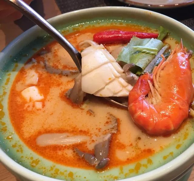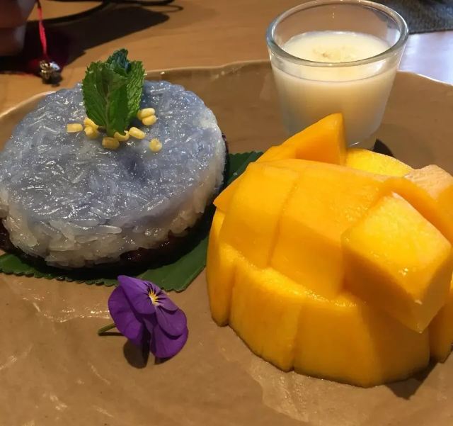 轻轻的一个蚊马沙文咖喱牛腩,咖喱浓稠,有着淡淡的奶香味,闻着就有食欲,口感顺滑,捞起来看到牛腩,多而且大又厚,更妙的是:牛腩在咖喱的作用下,极为软糯适口,这样的咖喱牛腩,来两碗米饭都觉得不够。 冬阴功配料丰富,鲜活的大虾,脆嫩的鱿鱼,还有菌菇,汤汁清新而味浓,更符合我的饮食习惯,大虾和鱿鱼在冬阴功里更为鲜甜和脆爽! 而今天让我惊喜的这道炭烧猪颈肉,配蔬菜沙拉,本身脆爽和细嫩猪颈肉,炭烧之后有微微的香味,再蘸上酱料,哇,越嚼越有味道,在配上蔬菜沙拉,口感更为清爽。 比较惹眼的是芒果双色糯米饭,颜色层次分明,看起来颜值颇高;芒果的香甜,无论是味蕾还是鼻息都很满足,而糯米饭说是双色,其实是三层颜色,分别是紫色、白色和黑色,而这些,全是用天然植物来染的,浇上椰汁,那鲜甜可口的味道融入糯米,细细品尝,味道满满。 中规中矩的通心菜,鲜脆而解腻。