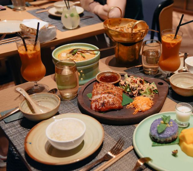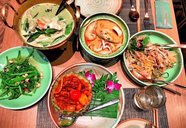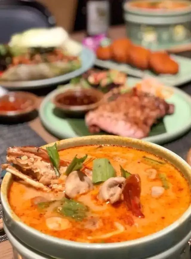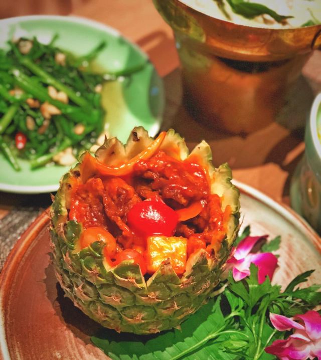 碳烧猪颈肉配蔬菜沙律,冬阴功,芒果彩虹糯米饭,马沙文咖喱牛腩,菠萝海鲜炒饭,泰式酸辣凤爪