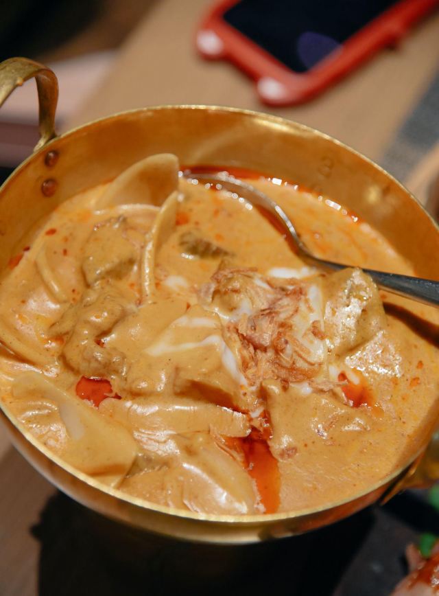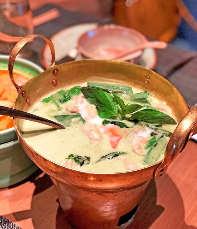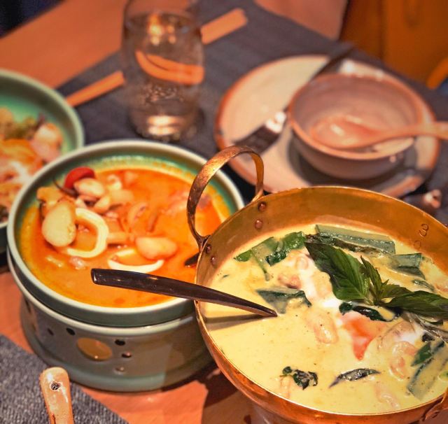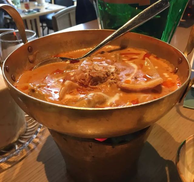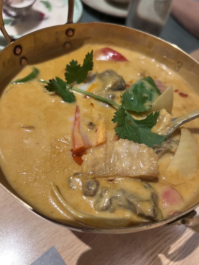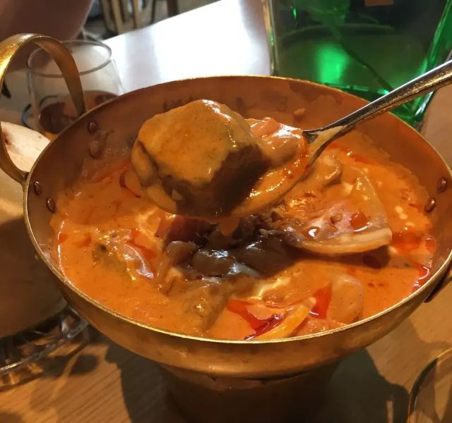 鸭鸭爱生活广州行的吃吃喝喝,吃腻了茶餐厅粤菜,便来打卡重口味的东南亚泰国菜。 芒果树,位于K11的七楼,整个环境就很梦幻,迎宾很热情,可以提前打电话订座。 主打便是东南亚泰国菜,团购还是很划算的,两个人吃撑。 马沙文咖喱牛腩,咖喱是必点的,米饭每次都要多吃两碗。而且泰国丝苗饭超级香。 冬荫功海鲜汤,酸辣开胃的冬荫功汤也是泰国菜的精华所在,有虾、花蛤、鱿鱼等等。 炭烧猪颈肉配蔬菜沙律,猪颈肉爽脆可口,蘸点酱汁搭配蔬菜沙拉一起吃,很完美。 芒果双色糯米饭,搭配椰浆,可以自由淋上,糯米饭也是心头好。 泰式奶茶,跟港奶还是有些像,夏天先来一杯,消暑解渴。 大概是广州最好吃的泰国菜馆了!