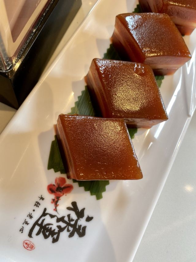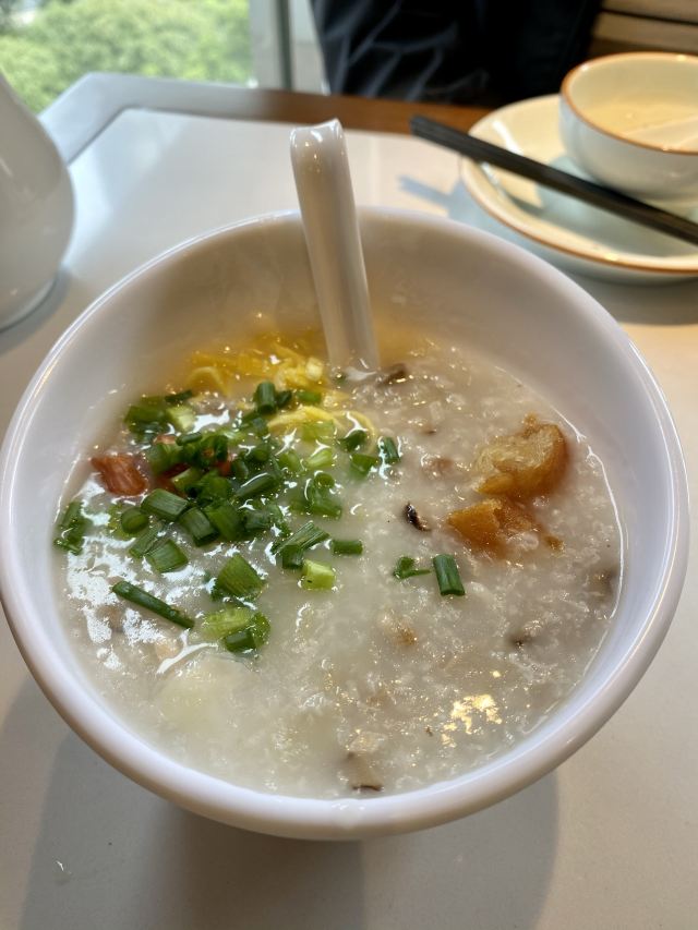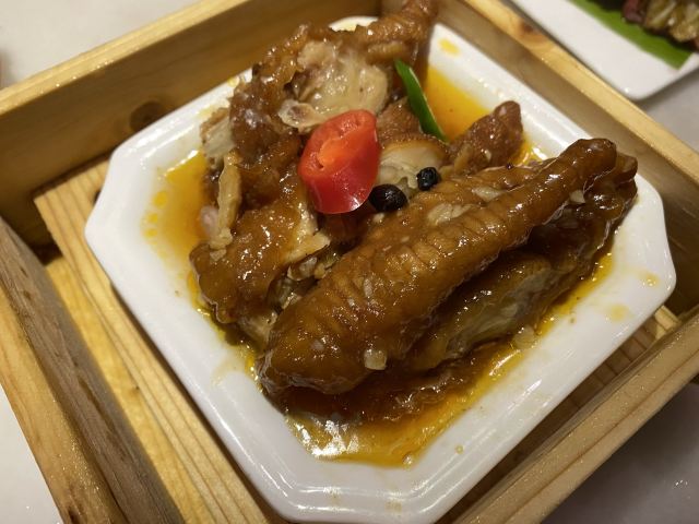 Luyunchaju (zhengjiaguangchang)晚上,朋友约我到禄运茶居•拔草餐厅(正佳广场店)小聚。 这家店位于天河路正佳广场五楼广正街内。幸好我们是六点钟前到达,否则就要在门口排队等位了。 餐厅不算非常大,装修得古色古香。一落座,服务员就会过来上茶,并递来菜单。这里可以扫码下单。 禄运参汤虾饺 28元,这是禄运茶居的招牌菜。用彩色的汤匙状的小碟子上来,有三只。参汤味道很浓,还有不少花旗参片。虾饺皮薄馅多,里面有四五只大虾,肉质结实爽口。 飘香榴莲鸡蛋挞 18元 心形的盘子内有三颗鸡蛋,蛋内装着榴莲蛋挞。蛋挞的榴莲味道浓郁,能吃到溜莲肉。这个点心颜值高,又好吃。 酱皇豉椒凤爪 25元 凤爪肥大淋香,非常入味 香煎腊味萝卜糕 15元 三大块的萝卜糕,煎得微黄,能吃到腊味粒和萝卜丝。 禄运腊味蒸饭 18元 满满的一大碗饭,里面有腊肠、腊肉、青菜,米粉香软,吸收了腊味的油脂和香味。 服务员小哥哥小姐姐笑容满面,热情周到。