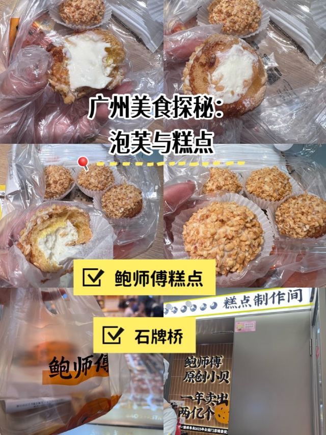 用这一口代表春天|泡芙控爱了 周末来到鲍师傅糕点(石牌桥店),位置便利,人气一直旺。 店内糕点种类丰富,用料扎实,性价比在线。 推荐:椰巧泡芙是必点款,外皮酥脆,椰香与巧克力香气融合得恰到好处,内馅绵密顺滑、奶香浓郁,一口爆浆完全不腻,口感层次丰富,路过石牌桥可一试。