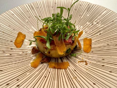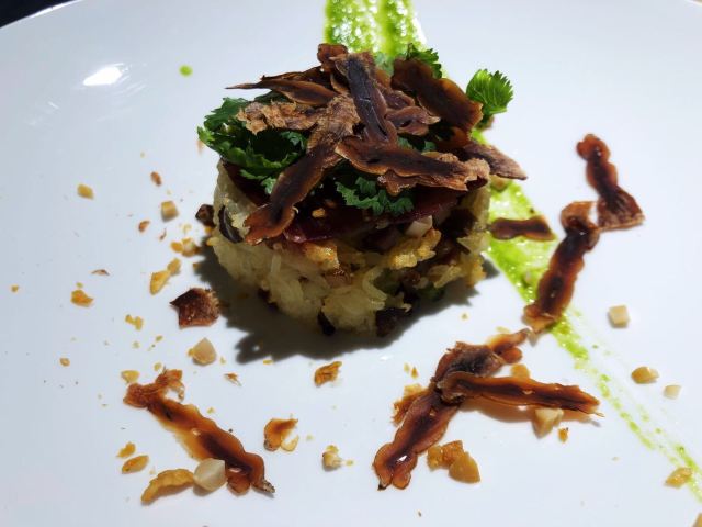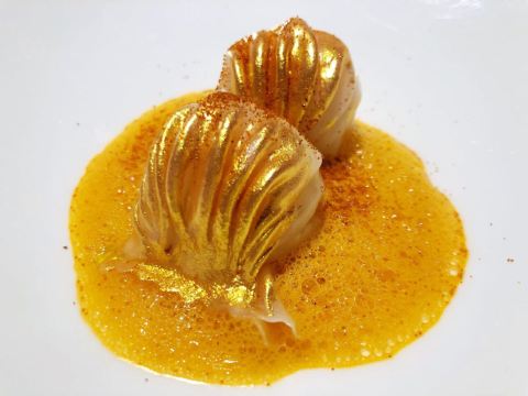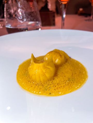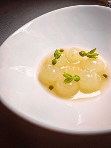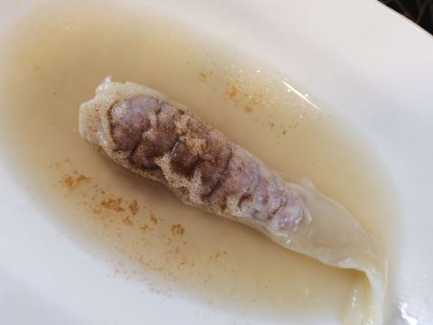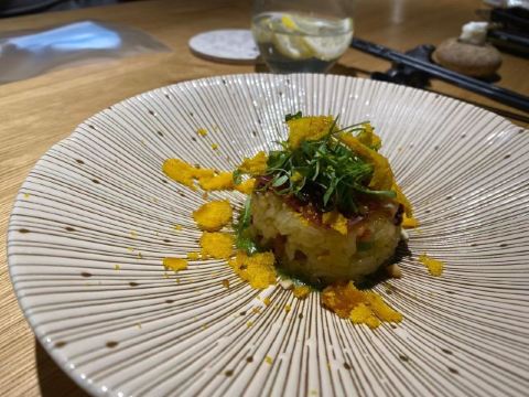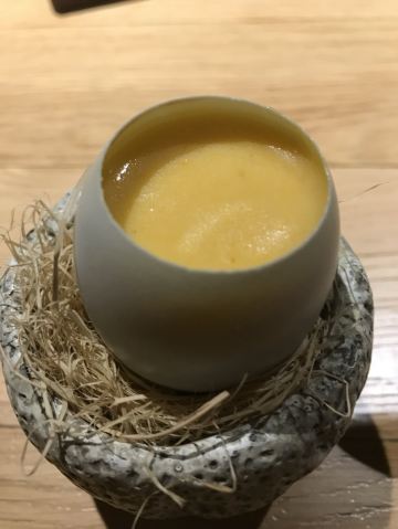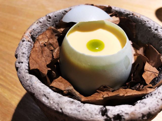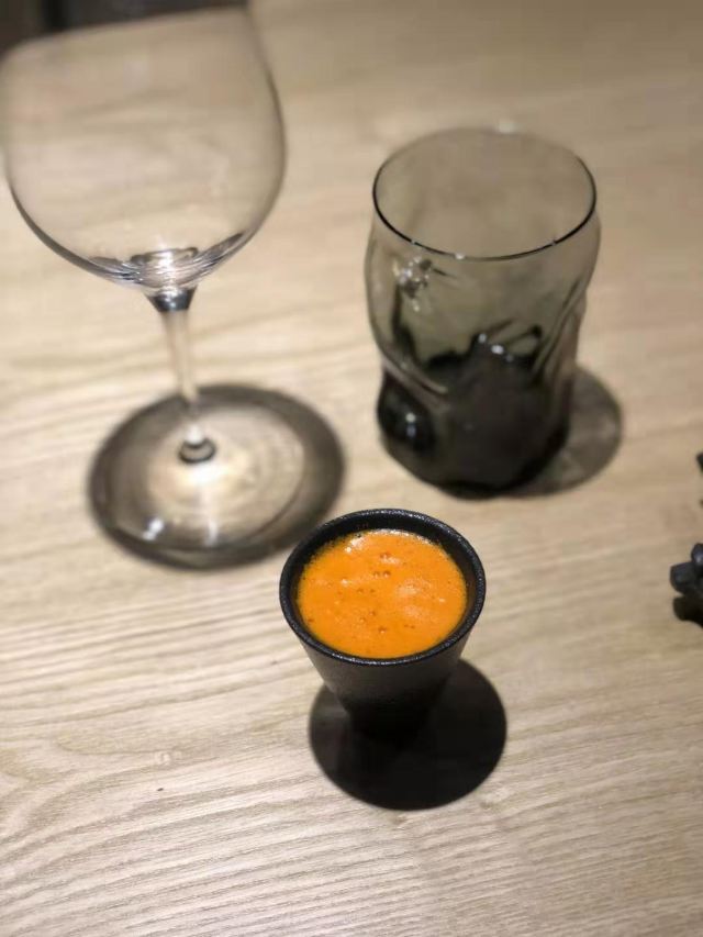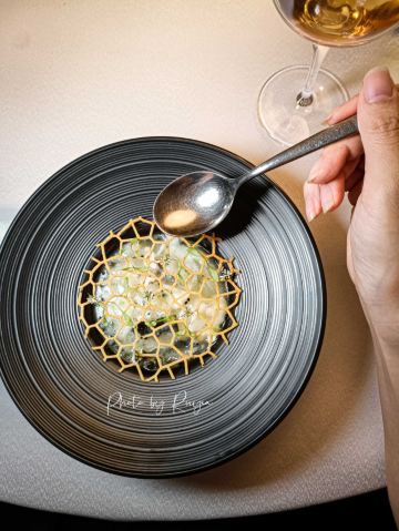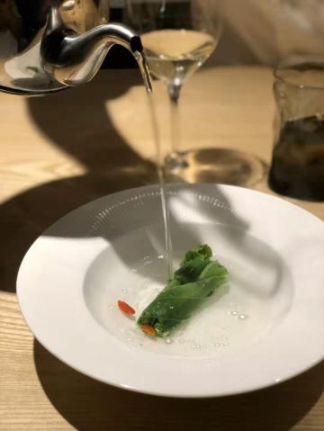 dr****chu当粤菜变成分子料理是怎样的体验? 解封了!约上闺蜜去“跃”壕一把! 就在新港东地铁站上面的南丰汇四楼,一出电梯一群服务员鞠躬欢迎,超有诚意~ 两个人坐在吧台方便聊天。选的是800元的套餐。 虽然是粤菜,但全部做成分子料理的感觉,特别新奇有趣! 「鱼子酱卤水鹅肝」鱼子酱在嘴里爆炸,鹅肝做成像芝士一样绵密,卤水香味很浓~ 「姜葱白切鸡」鸡是好🐔,很有🐔味,皮脆肉滑还没有骚味~正! 「疯狂的石头」上桌吓到我,这是石头?能吃?咬一口发现原来是酸辣鸡爪哈哈哈哈哈,绝! 「黄花鱼饭冻」又一道上桌令人迷惑的菜,以为是猫粮,其实是黄花鱼饭冻,吃起来像咸啫喱哈哈 「豉椒牛肉」这个是我全场最爱!牛肉三分熟很嫩,表皮裹着豉椒汁,爆香!真想再来一碟! 「西班牙火腿乌鱼子腊味饭」樱花虾+以利比亚火腿+乌鱼子炒腊味,这碟饭很豪横啊! 整个用餐过程超有仪式感,主厨全场一对二服务,详细介绍每道菜的创作灵感~~像看了一场美食秀~ 地址:新港东路南丰汇4楼 🚇新港东地铁站F出口上来问保安就知道怎么走了[呲牙]