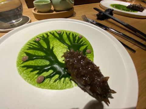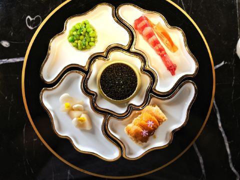 鱼子酱卤水鹅肝,护国海参,姜葱白切鸡,豉椒牛肉,酥皮溏心鲍,凉拌鱼皮,西班牙火腿黑松茸腊味饭,白切鸡