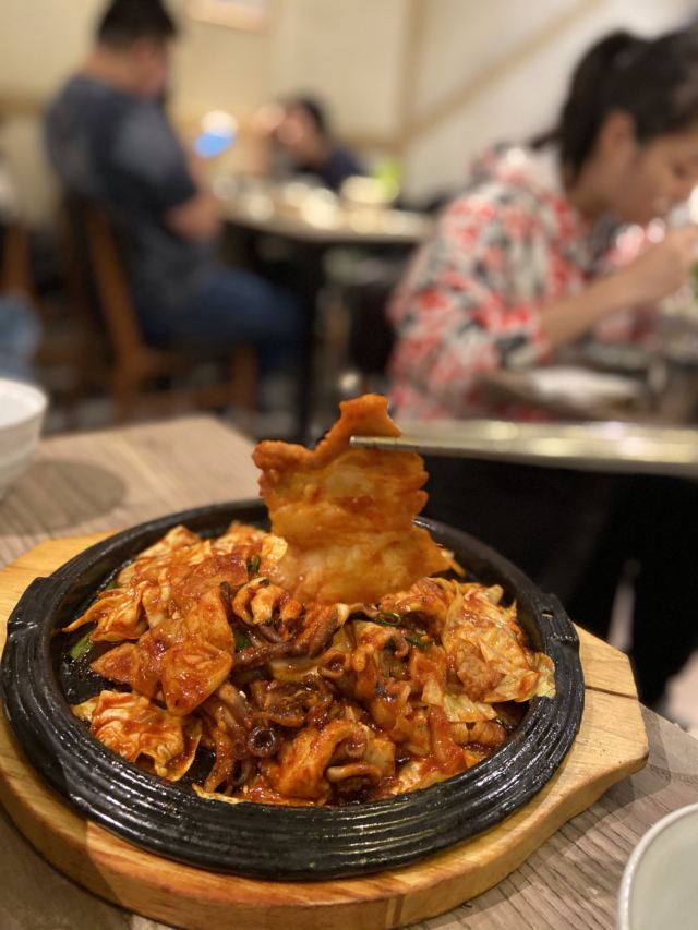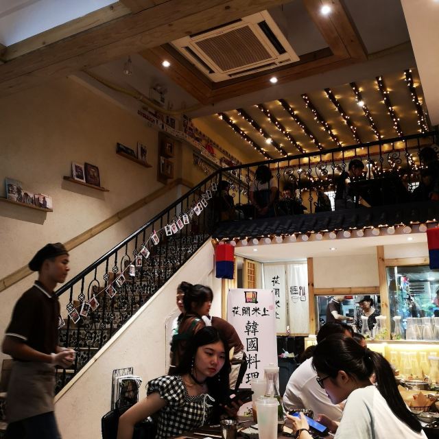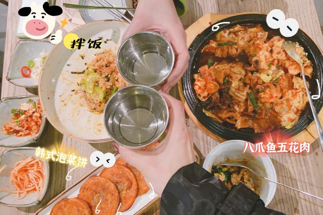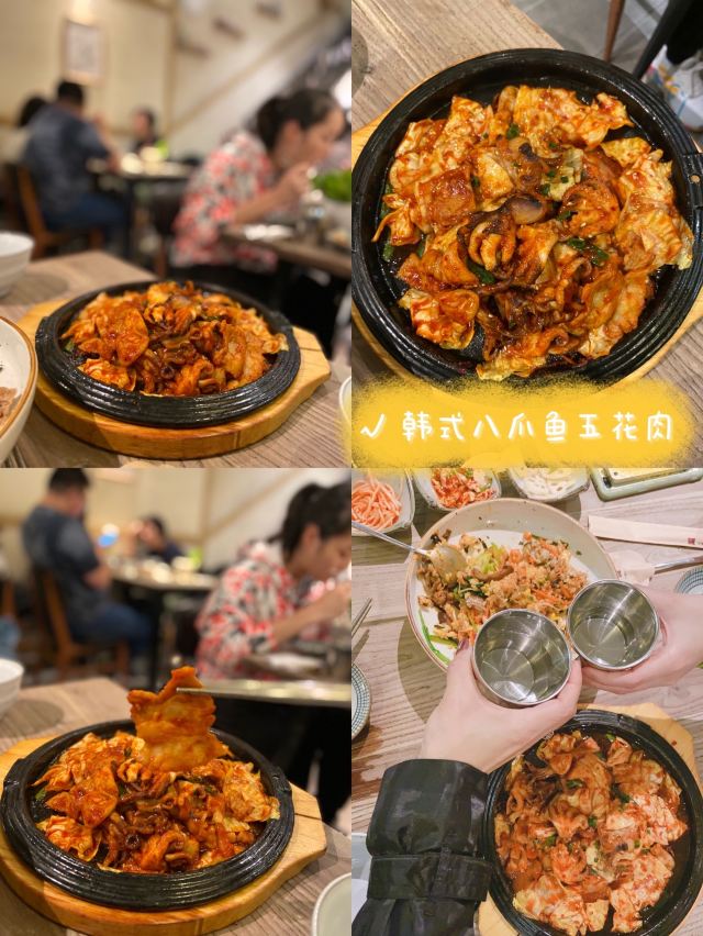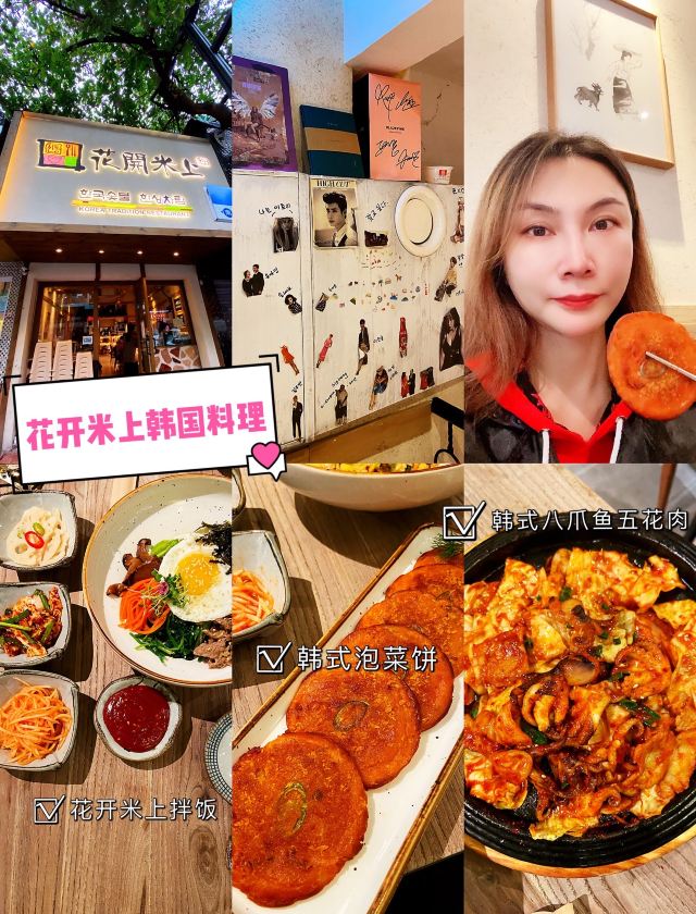 Huakai Mishang打卡韩国料理热门餐厅|正宗韩式八爪鱼五花肉最赞 💕次次经过花开米上都被它门前的人龙吓跑了,刚好今日很早经过惠福东路,就去拔草一下! 🏡环境: 原木的装修风格,黄白相间非常简约,二楼的阁楼位置不多,但是挂了小灯,感觉很温馨。墙壁上都有不少韩国帅哥的poster,忍不住拍拍拍! 🍽推荐菜: 🐙韩式八爪鱼五花肉,这么大盘只卖69元,八爪鱼新鲜,五花肉入味,伴碟的大白菜也太好吃了,停不了嘴! 🍚花开米上拌饭,38元的一大碗,紫菜、蔬菜、太阳蛋、拌饭酱,有店员的贴心搅拌均匀,很快就光盘了。 🇰🇷韩式泡菜饼,现做的等待时间大约十多分钟,热辣辣上桌的时候香气飘溢,马上吃的时候感觉好脆呀,冷了吃起来就没那么热气。 🏠店铺:花开米上韩国料理 🚗地址:广东省广州市越秀区惠福东路451-112号 #越秀区美食# #吃在广州# #同城种草# #网红餐厅# #韩国料理# #热门榜餐厅#