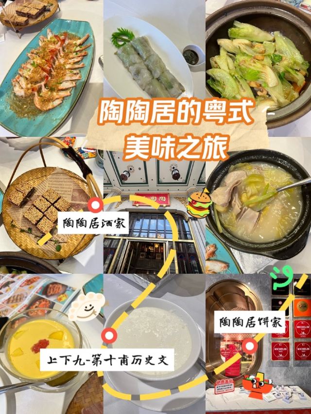 冰花沙翁,陶陶居脆皮乳鸽,桂花蛋散,怀旧纸包骨,陶陶居大虾饺,百年陶陶居烧鹅,卡珍芝士糯米鸡,冰镇咕噜肉,鲜果榴莲天鹅酥,锦绣海鲜红米肠,水牛奶菠萝包,粤式肠粉,干炒牛河,一口脆豆腐,凤爪,粤式早茶,虾饺,烧鹅
