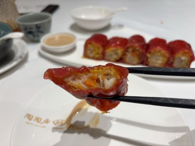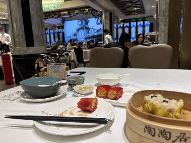 泰迪小熊2013年6月29日来的。 陶陶居是广州茶楼的顶流,而且这家分店是开在老牌商业街上的本店,我是特地选择来这家的,因为来这里吃饭根本就是一个旅游项目了。 一大早到店,里面已经有很多人了,我是独身一人,自然只能和人拼桌。店里没有服务员领位,位子都是自己找的。正当我不知坐哪里合适时,一个阿婆发现我对说了一句啥,发现我听不懂广东话,切换成普通话“坐这里吧”,标准广普口音……整个过程也是非常真实的“旅游”体验。 坐下之后看看周围,发现食客大多还是本地人,男女老幼都有,貌似还看到了传说中借早茶的契机相亲的场景……可以说,在这家店的大堂里,也能看尽老广生活的人间烟火。 食物就不评论了,好吃,我一个人放肆地吃,结果吃撑了,中午饭都直接pass了。