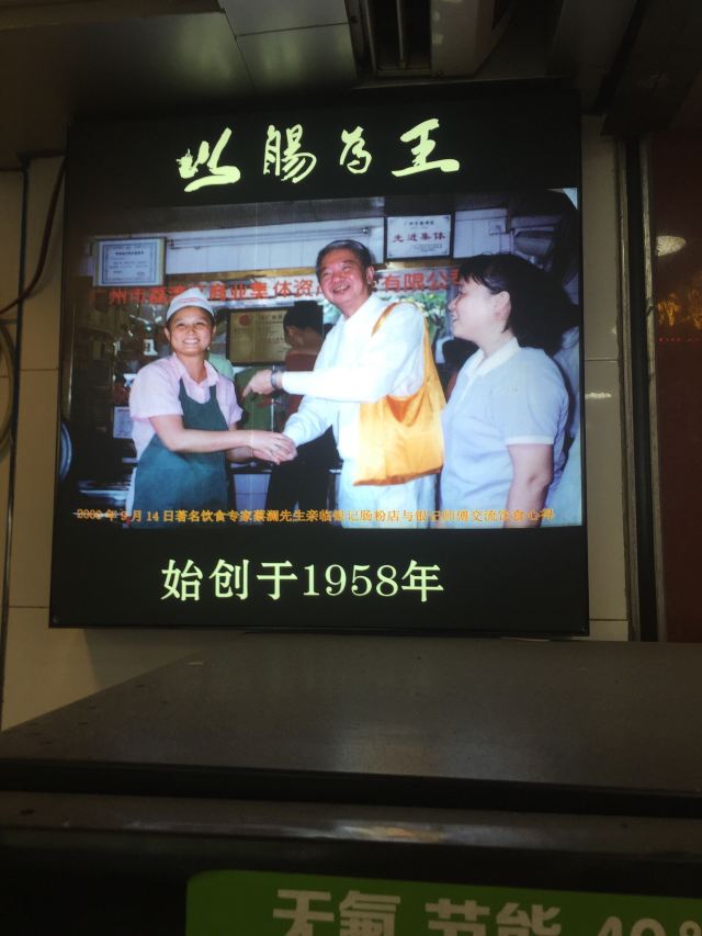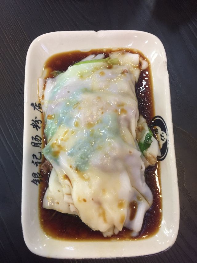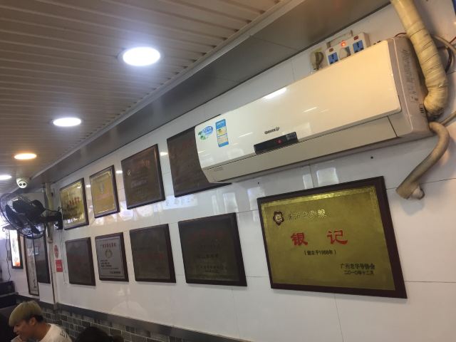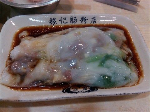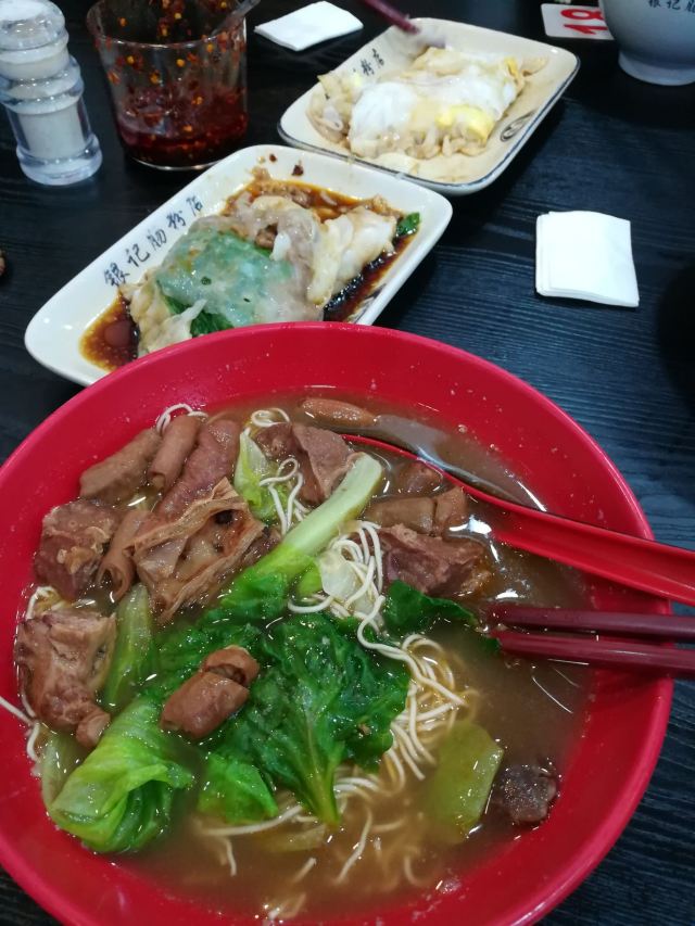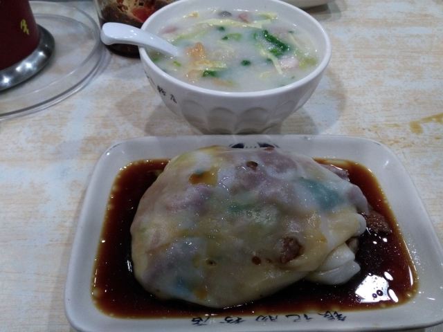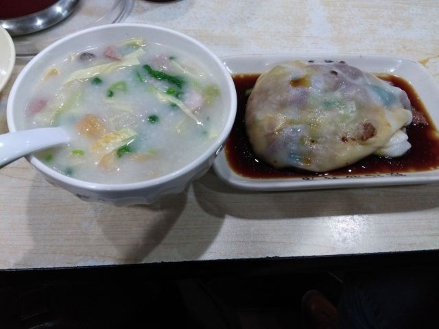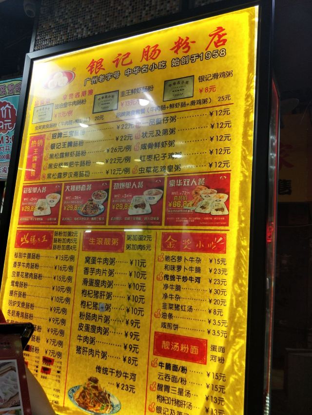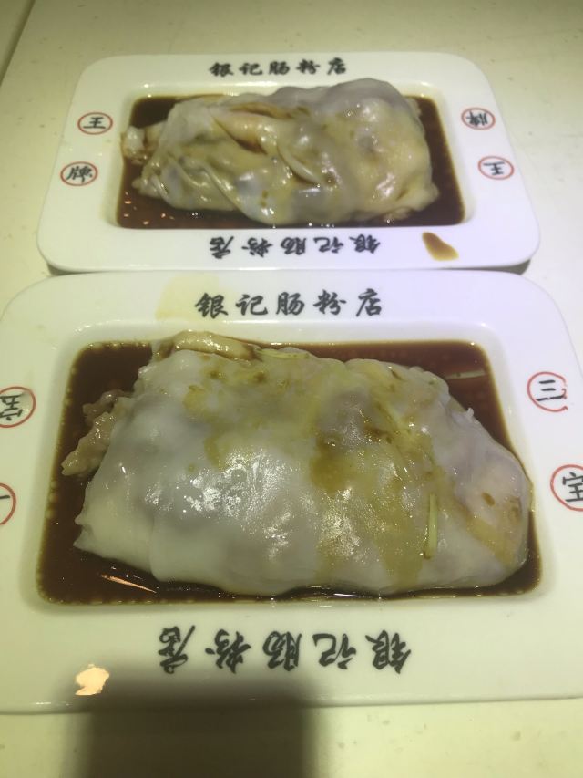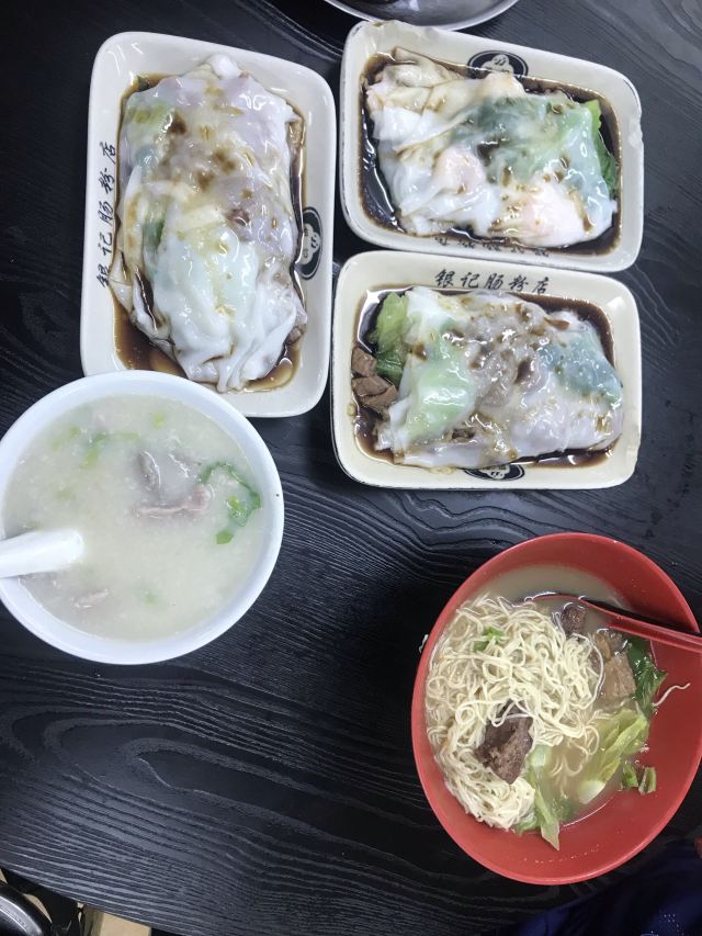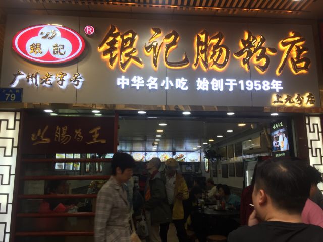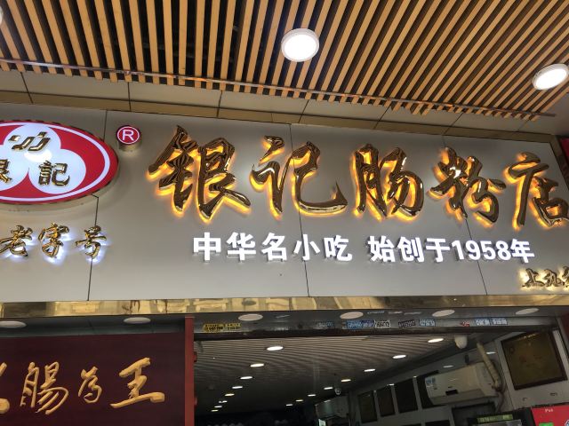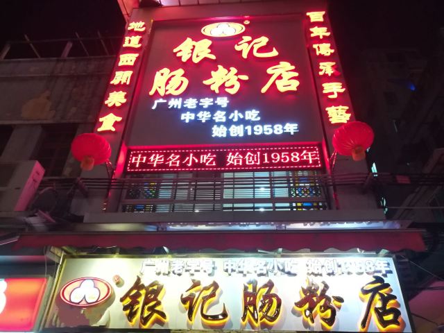 食行天下旅行家广州最为有名的老字号粥粉店,创建于50年代,现如今已开了多家分店。这家店位于上下九步行街的上九路,按年头来说算是一家老店了。店的门脸不大,里面面积很小,简单的布置了几张桌椅,空间狭小,布置也非常简单,感觉和路边的小食店几无区别,墙上挂的满满的各式牌匾和照片诉说着银记的历史和荣誉。要说最为显眼的还是美食家蔡澜先生题写的“以肠为王”四个大字。环境虽然简单,但却阻挡不了趋之若鹜慕名而来的各地食客的热情,小店里满满当当的坐满了人,在这儿吃饭不拼桌是不可能的。而他家的出品也是非常专一,就是各式肠粉和几种粥。 要了最受欢迎的金牌牛肉拉肠和黑松露鲜虾肠 粥是艇仔粥和及第粥。他家的肠粉确实非常好吃,总结起来就是粉皮白细,薄而透,味道鲜美,入口爽滑。粥也是不错的,还是最喜欢艇仔粥。里面的配料很丰富,鱼片,干贝,瘦肉,鱿鱼,蛋丝,还有油条和炸花生等,喝起来营养好味。及第粥是在熬得白白的粥里加入猪肝、瘦肉、猪肠等,味道不同于艇仔粥,也是非常有特色。 总体来说感到满意,特别喜欢他家的肠粉,感觉还是名副其实的,至少符合我的口味。