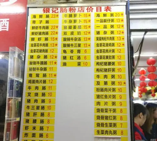 鲜虾牛肉肠,叉烧肠,状元及第粥,鲜虾肠粉,鸳鸯肠,滑鸡粥,艇仔粥,皮蛋瘦肉粥,双皮奶,粤式肠粉,豉油王牛肉肠,龟苓膏,猪红汤,牛肉鲜虾双拼肠粉,至尊肠粉,虫草花鸡粥,鲜虾粥,牛肉粥,虾拉肠,牛肉肠粉,鱼片粥,猪肝粥,叉烧肠粉,鸡粥,拉肠,虾肠,牛肉腸,炸面肠,韭黄鲜虾肠,肠粉,鸳鸯肠粉(牛肉+猪肉),招牌牛肉肠粉