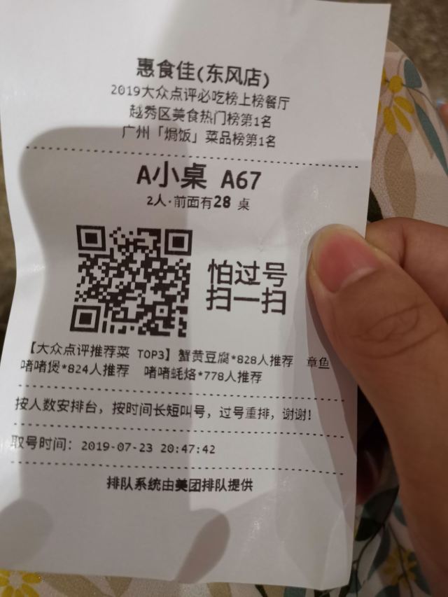 婉儿Chan打卡广州米其林星级餐厅-惠食佳(东风路店) 惠食佳因为上过舌尖上的中国第二季后,一直很火。年初三特意去探店。餐厅没有停车位,要自己在附近找,不便宜,16元一个小时。 [薄荷]环境: 环境还好,之前看评论说通风不好,油烟多,有点担心,去了后担心没有这个问题。因为怕排队,上午10.30就到了,看到没看门,后来发现里面已经有几位顾客在排队拿号了。如果是直接入座的话不用拿号,不过要等11点才能下单。 [服务铃]服务: 不知道是否春节人手不足,总是很难叫到服务员。 「啫啫蚝烙」79元。锅看起来很大,但是超级薄的一层,生蚝和海鲜也非常少。是很酥脆的蚝烙,味道还不错,但是不惊艳。性价比很低。 「啫啫黄鳝煲」89元。黄鳝很肥美,也很入味,这道菜还不错。 「腊味饭」79元,吃到腊肠的时候比较香,米的确不错。一煲有6小碗。 「啫生肠」79元。分量很少,生肠很脆,但是不入味。 「三家巷啫啫肠粉」49元。斋肠粉,味道是偏甜的,大家一致认为没有陶陶居的牛肉珍珠肠好吃。同样的价格,陶陶居的还有牛肚,味道也更好。 「咸蛋黄啫凉瓜」49元。分量也很少,味道还不错,也没有很特别。 「姜撞奶雪糕」16元一个。姜味的雪糕搭配炒芝麻和炒米,口感很特别,也好吃。大家一致比较认可的出品。 大厅茶位费10元/位,春节期间加收10%服务费,但是并没有什么服务可言。人多的话人均会相对低些,要不挺好的。出品味道不错,但是分量少,味道也真的不惊艳,排队的话不值得。广州现在又其它粤菜馆也有一样的出品,环境和性价比可能还好些。