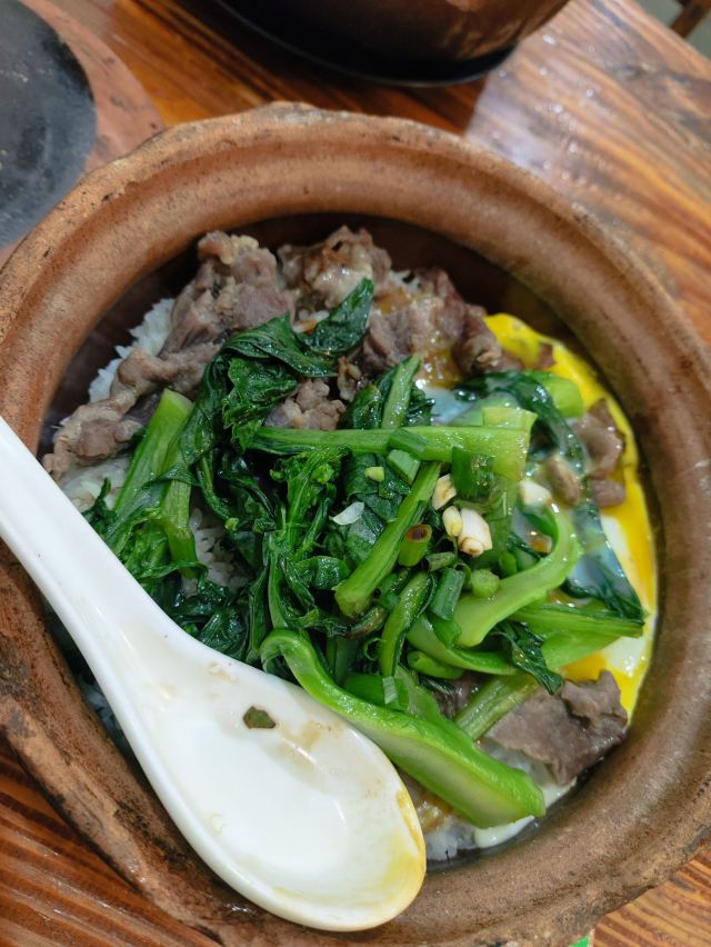 迪斯卡沃万兴真的是人气超高,两个房间都被坐满了人,转了好几圈才在过道找到位置,于是就吹着冷风吃完了一锅煲仔饭 🌟双拼煲仔饭 ¥29.5 为了方便比较点了和超记同样的搭配,牛肉+田鸡+窝蛋。牛肉蛮嫩但筋还是很多,不知道为啥两家煲仔饭的牛肉都这么难咬 米饭比超记更湿,感觉像在吃焗饭,但莫名很有炭火味,还挺好吃的。不过锅底的饭焦很碎还糊掉了,有点尴尬。 配菜有包菜/菜心/白菜/豆角四种,当天遇到了包菜,觉得怪怪的,之前一直以为都是菜心哎。