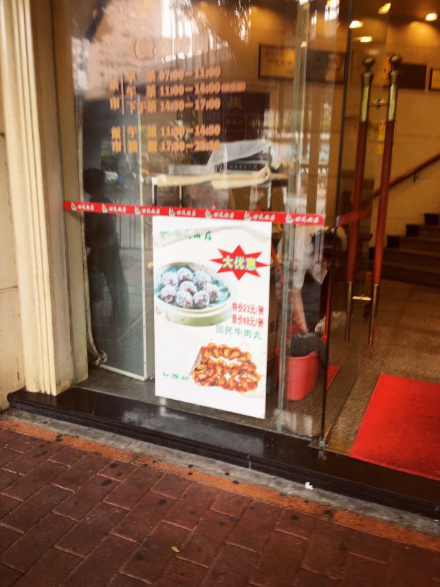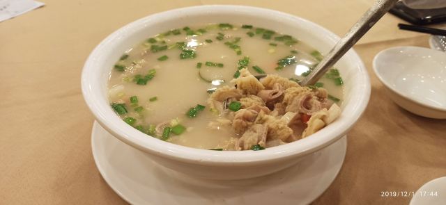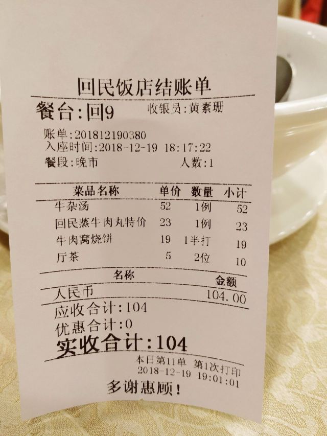 芳芳Flora经常路过回民饭店门前,也听说它家有好多年了,它家的位置正好在中山六路和人民中路交汇处,也算是经常出现在大家对话时确实位置的一个地标点了。呵呵。一直没机会试试,这天在中六附近办完事,LG下班后来这里和我汇合,原本还没想到要去哪里吃晚饭的,LG突然说去回民饭店吧,我就说好啊、反正我没去过、也想试试的了。于是我们就来了。傍晚6点到店,店里二楼大厅已经很旺场了,几乎坐满了客人,服务员指我们去后面的茶皇厅,但在还没走到茶皇厅的时候,就发现角落靠近窗边有张空桌子,我们就坐到了这个窗边位置。快速地点了三个菜,上菜也挺快的。牛杂汤,52元。牛杂切得比较细碎,应该是金钱肚和毛肚的部位比较多些,汤是放了不少胡椒粉,不过挺喜欢这种味道的,冬天里喝,比较暖胃。回民蒸牛肉丸(特价)23元,牛肉丸里有些爽口的沙葛,牛肉味道挺鲜的。牛肉窝烧饼,19元半打。这个烧饼好好吃,外面的皮很香脆哦,推荐!茶位费是5元/位。埋单104元,人均52元。有机会还会再来试试别的菜式的。