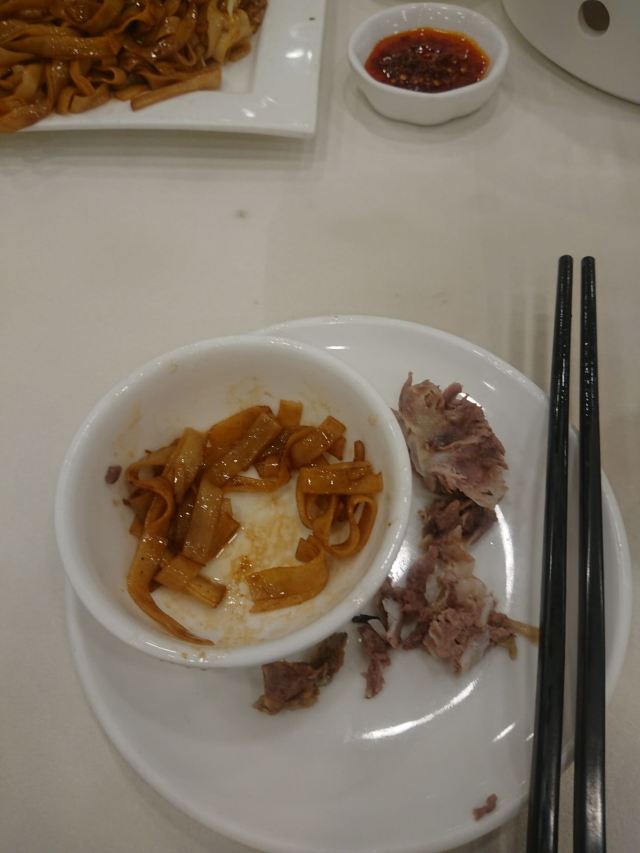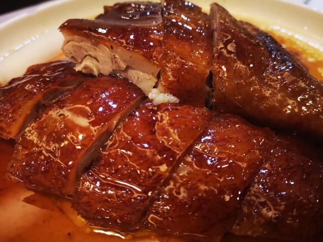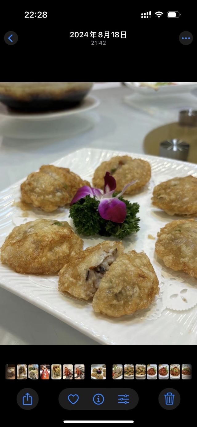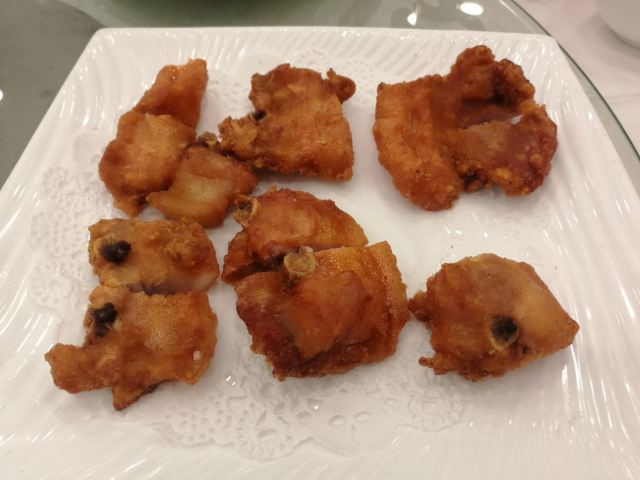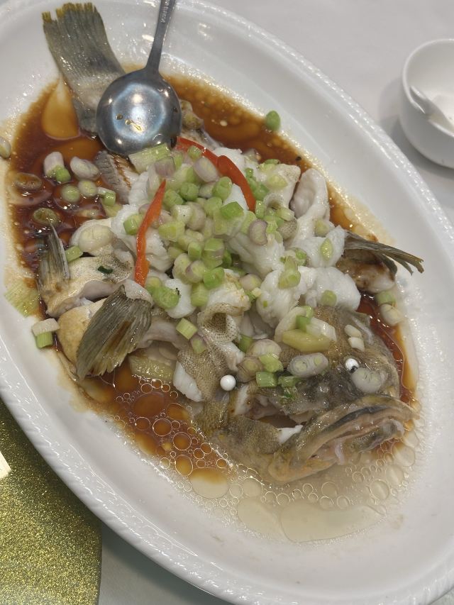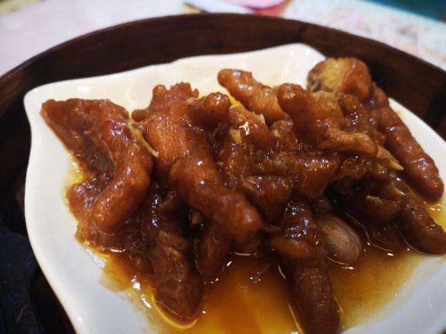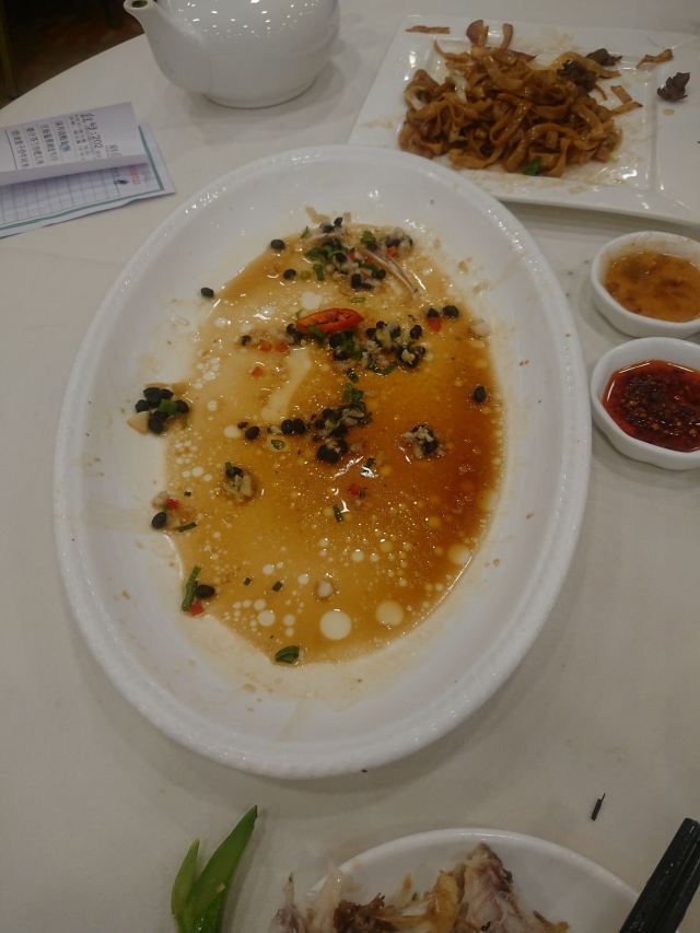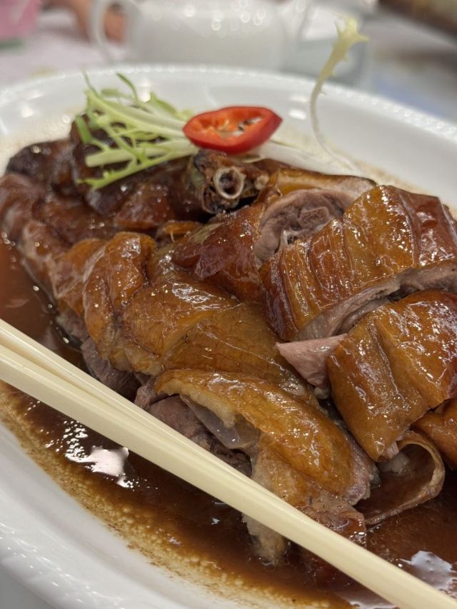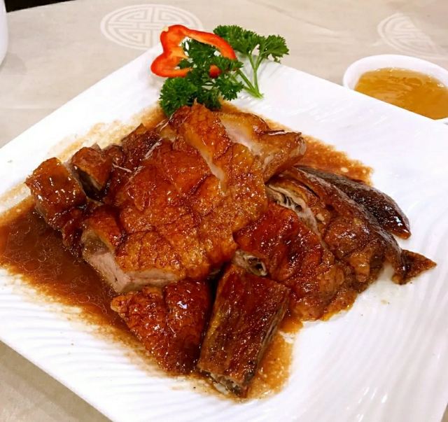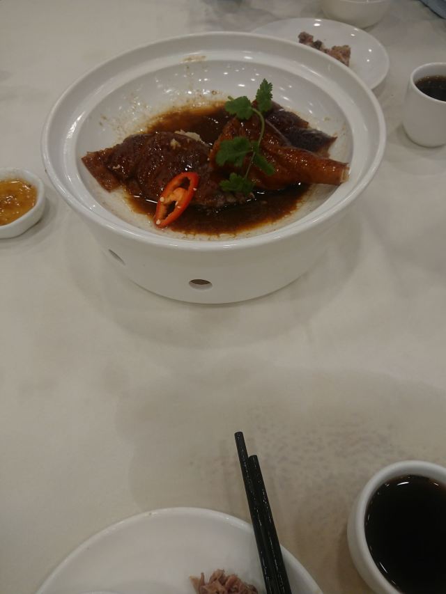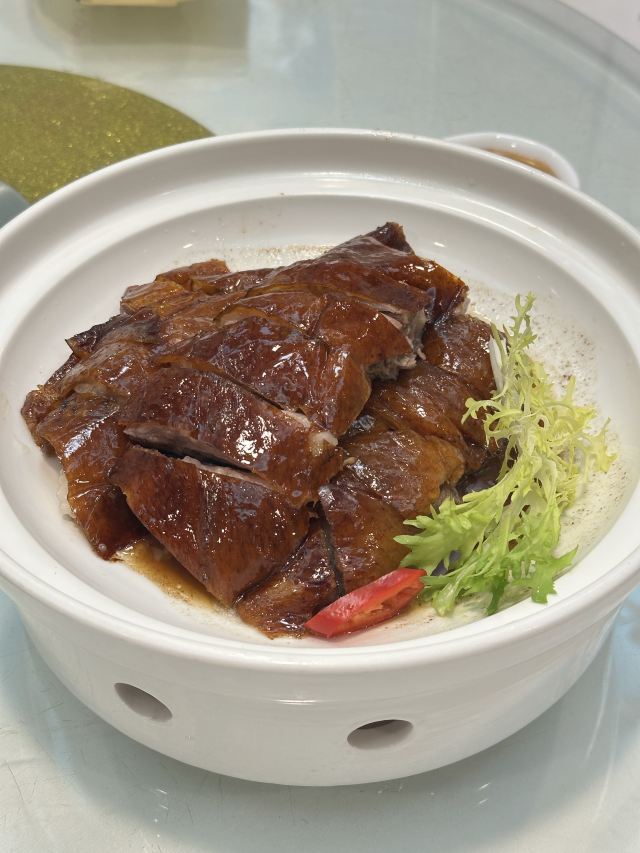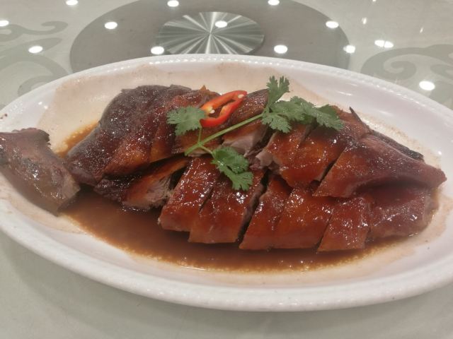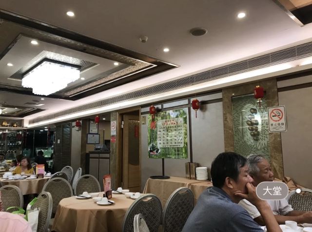 陌染MM那天在附近办事,之后找个地方喝早茶,就来到了这里,餐厅位于仓边路上,在富豪酒店的三楼,三楼全层都是它的,一出电梯就是餐厅的大厅,天花很低,会有点压抑感。看餐厅的硬件和软件都像是传统港式酒楼的样子,装修很老式,服务员们都是中年的大妈。 餐厅的点心都是即点即做的,所以蒸笼的食物上菜时间会长一些,但是食物的确是新鲜很多,热很多,好吃很多。这里的碟头原来是很大的,我们还是头一次来这里吃东西,所以不知道,三个人点了七份点心,吃不完。点了一份蒸咸肉粽,一个算是蛮大个头的粽子放在蒸笼的中间,粽子里面放的料很多,是传统做法的那种,有肥肉和去壳绿豆,糯米很绵,平时在餐厅喝早茶我都没有点粽子的,但是看到隔壁桌的以后,自己点了,也真是推荐。 蒜香蒸凤爪和蒸排骨都是热乎乎的,刚刚蒸出来,非常新鲜,凤爪的分量不错,有好多只爪子,但是排骨就差了一点点,因为排骨都是以肥肉筋为主,肉很少,味道就调得挺不错的。烧鹅濑粉我是无意中点错了,来的是一碗汤粉加一碟烧鹅,变成了两样食物了,这里是专门吃烧鹅的餐厅,水准应该会高一些,烧鹅濑里的烧鹅皮已经软了,但是肉还是有很香的肉味。 这里的价格不贵,食物分量足,出品也不错,就算是早茶时间,也有不少的年轻人去吃,服务员的态度也很好,值得推荐。