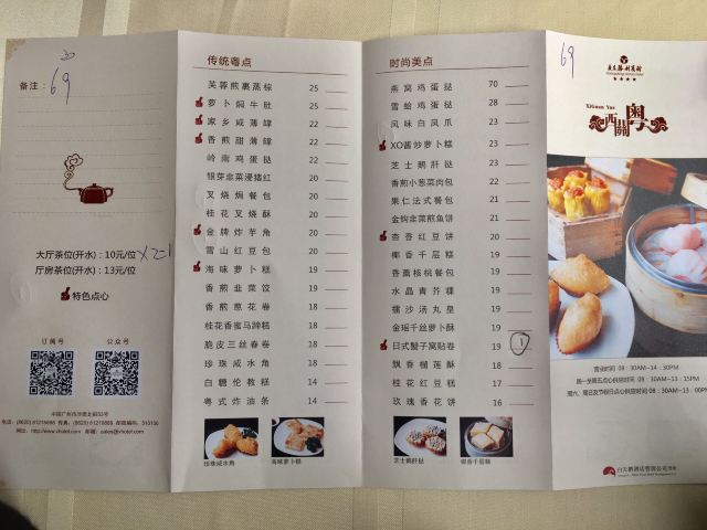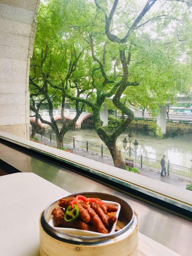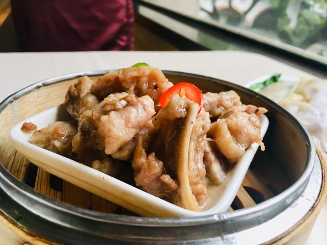 XIGUAN YUE珠江河畔,渡轮穿梭,江风徐徐;古树婆娑。沙面,广州最具欧陆风情的城南小岛,曾经的英法租界,它亦中亦西,亦古亦今。150多栋西洋文物小楼,仿佛来自民国的梦影摇曳在街心。 在这些古建群里,原为英属维多利亚酒店的广东胜利宾馆临河而立,巴洛克式的拱廊浮雕,每一个仰角都散发着年代的迷人气息。 进入大堂,左侧陈设着老店遗留的家私和装潢,繁冗而华丽的手工透着过去时光的温润与精致。对它的感觉,如同上海的和平饭店,好似许多玄机和故事暗藏其中。 西关粤中餐位于酒店二楼,前台接待在酒店侧门,独立于酒店大堂之外,与酒店客人互不叨扰。餐厅8:30开始营业,8:00去时已有不少本地老饕在取号等候,由于到得较早,我拿到了为数不多的窗边双人位。 [环境] 餐厅为老式建筑设计,大厅宽阔明亮,但与景观拱廊完全分离,拱廊十分狭窄,只能安排双人座,但是每一桌都拥有一大窗的盎然绿荫,让人欣喜不已。在玻璃外的林荫苍枝、悠悠河道的陪伴下,三个人太多,两个人刚好。 [服务]♂️ 从前台接待的主管到服务员,都体现了周到和细致,虽然拱廊与大厅隔离,但并没有被忽略,不时有主管和服务生过来看看这里的客人有无需求。 菜品 上菜速度很快,下单后10来分钟基本接连上齐,西关粤的早茶有口皆碑,既保留传统又有独特的配料创新。 「黄皮酱蒸排骨」不得不说黄皮酱的味道比豆豉的更别有一番鲜美清新的滋味,排骨蒸得嫩滑,肉汁浓郁。 「金酱蒸凤爪」很好地把控了传统的味道,酱汁和火候都到位。 「榨菜牛肉肠」加入了榨菜的牛肉肠带上了些许潮州菜的特色,大片的牛肉十分细嫩入味。 「日式蟹子窝贴卷」有一点芥末的加入,让蟹子清爽起来,香脆可口而不辛辣。 「脆皮紫薯果」紫薯果里面是猪油芝麻,香甜而不腻。 在浅粉色的老房子里,看云行天空,听叶落窗前,任时光恍惚,就这样来一次文艺、穿越的早茶。