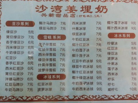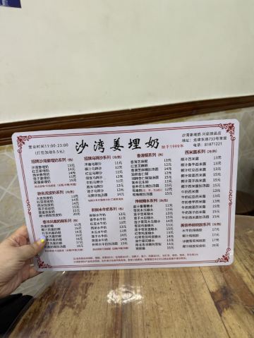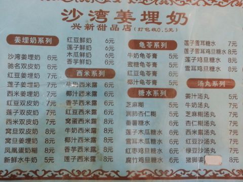 红豆双皮奶,红豆马蹄沙,绿豆马蹄沙,驰名双皮奶,水牛奶,椰汁凤凰奶糊,沙湾姜埋奶,凤凰奶糊,椰汁马蹄沙,芝麻糊和双,红豆姜埋奶,润肺杏仁糊,双皮奶,糖水