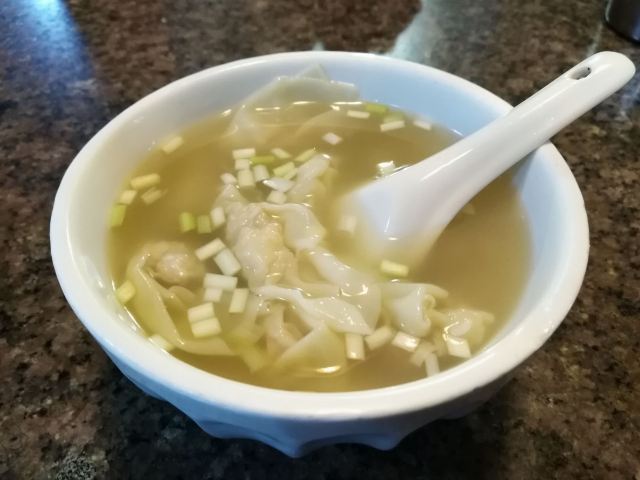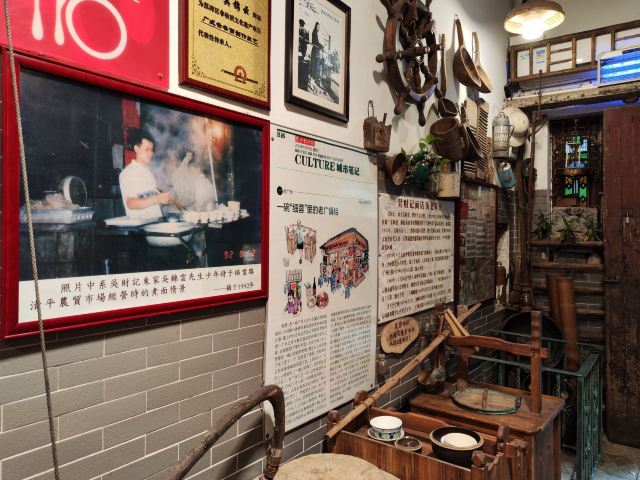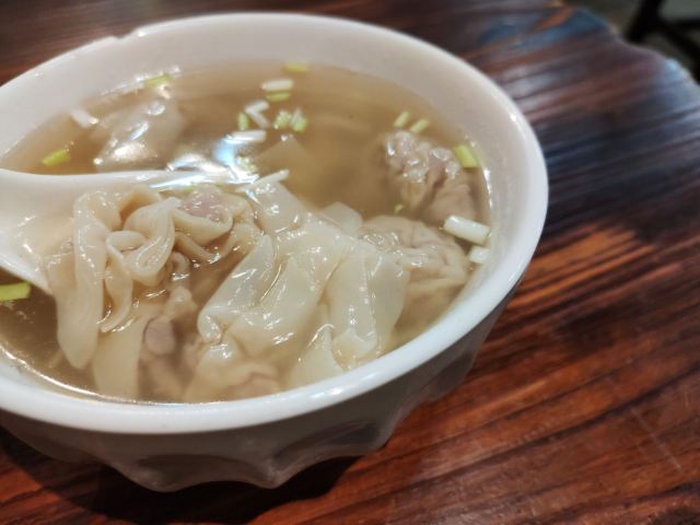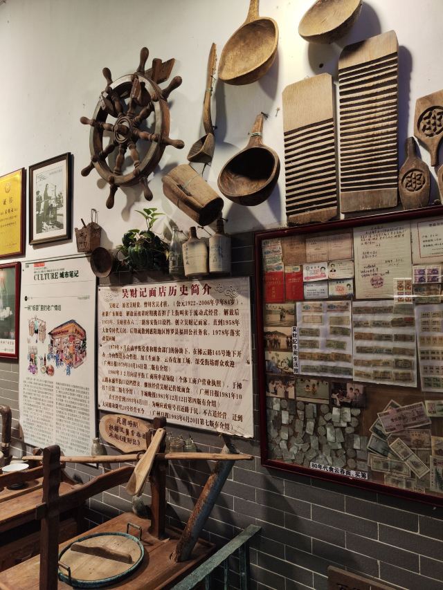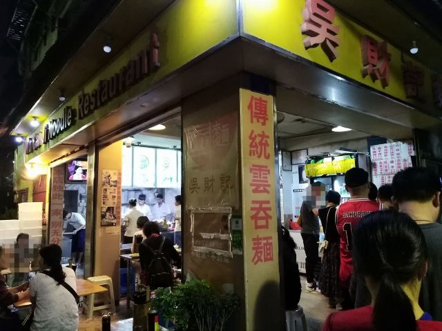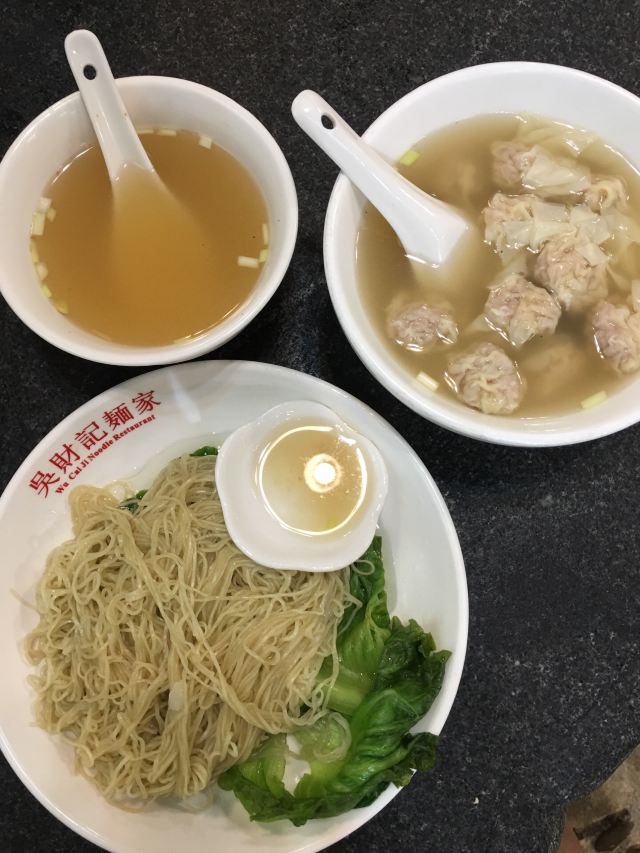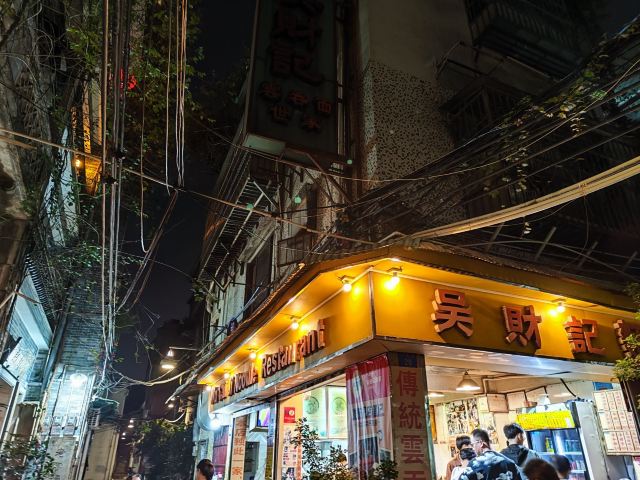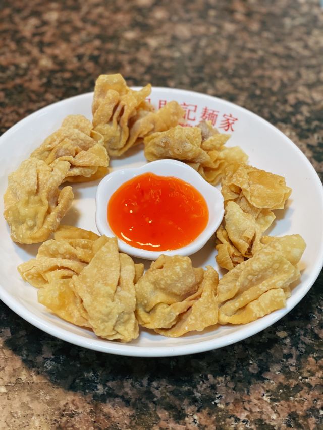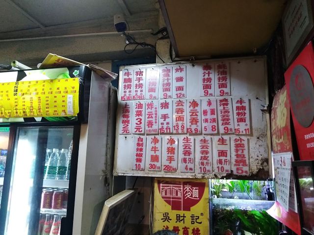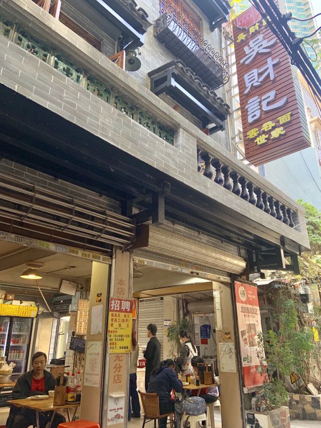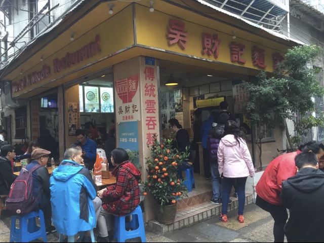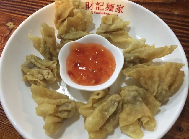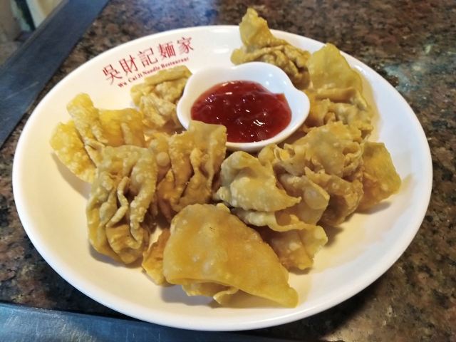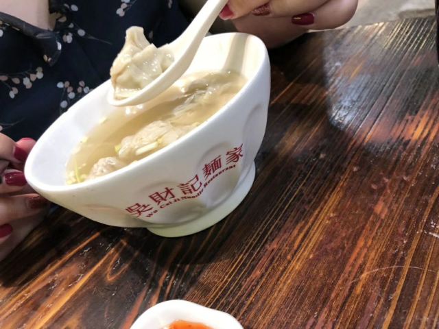 陌染MM从黄沙地铁站D出口左行到清平市场(梯云东路),穿过市场的第一条小巷,进入大同路,向左手边直行到底,右转,直行并向右手边的小巷望去,到和隆里,会看到很大的吴财记广告牌,进入和隆里直行就可以到达了。“吴财记”开业于1980年,由现任老板吴锦云的父亲吴老先生经营,不过他的爷爷早在1958年就开始经营“细蓉”了,那时还是在街边摆卖。绕过喧嚣的市场,沿路直行,往小巷里看,就看见了一个大大的招牌“吴财记”。踏着古旧的石板路,铺面很小,装修充满香港特色的“吴财记”就会出现在眼前。另外,老板从采购到做工,都是自己一手打理,从而降低经营成本。因此,老字号 “吴财记”的价格公道实惠,为的是传承这个味道,让普通人都能吃上传统的味道。 要了一份小的云吞面,面条很弹牙,一条一条非常通透,汤底清晰可见,吃得出淡淡的虾皮、猪骨、大地鱼的香味,面条弹牙也煮得火候刚刚好,所以不会粘在一起。云吞里面的肉很新鲜,粒粒饱满,大小适中,我是吃得挺不下口,连汤都包了。 另外一样多人吃的就是松脆炸云吞了,由于店家在制作的过程中,在云吞皮里加入了鸡蛋,加上师傅的火候掌握得很好,所以炸出来的云吞是松脆,而不是硬脆。平时很多时候吃炸云吞都会把上腭给磨破皮的,但是这里吃的不会,只会越吃越想吃。