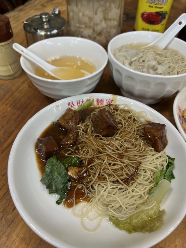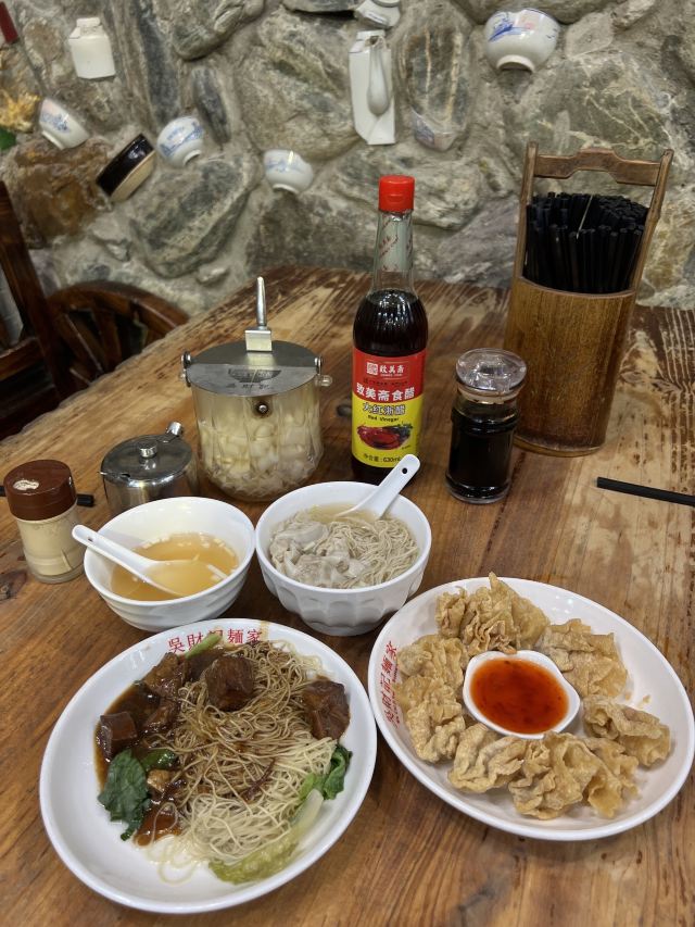正牌一旧云小长假打卡地方特色美食|隐藏在大同路的老字号面家 藏在荔湾区大同路和隆里20号的老巷里的吴财记面家,推门就是满满的烟火气,木质桌椅带着岁月痕迹,天井透光大厅却收拾得利落清爽。伙计煮面、捞面动作麻利,热气裹着面香瞬间漫开,连等候时的期待感都变得具体。 作为老广私藏的面家,它的出品满是地道风味。牛腩捞面的牛腩炖得酥而不烂,咬开还带着肉汁,碱水面裹满浓稠的酱汁,每一口都筋道入味;炸云吞外皮金黄酥脆,咬下去会“咔嚓”响,内馅鲜弹多汁,蘸上甜辣酱刚好中和油脂感;云吞面的汤底清亮,喝得出是用猪骨慢熬的鲜,云吞皮薄如纸,虾仁饱满Q弹,碱水面口感爽滑,一口面一口汤,鲜得很扎实。 老广的面讲究“镬气”和“本味”,吴财记把这点拿捏得很准。它没有花哨的摆盘,却靠几十年不变的手艺留住食客——牛腩的软糯、云吞的鲜甜、面条的劲道,每一口都是老广州的烟火记忆,不追求惊艳却让人吃得舒服又满足。 金筷子值:3个金筷子 值得专门为这口老广味跑一趟老巷 🏠店铺:吴财记面家(大同路店) 🚗地址:广东省广州市荔湾区岭南街道大同路和隆里20号