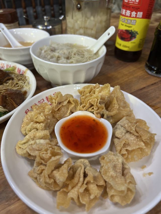 迪斯卡沃广州美食|吴财记面家 可谓是声名远播的一家必吃榜。从恩宁公啡散步到吴财记,夕阳西下,阳光散落老城区,街道人来人往,真的拥有了城市漫步的一切美好,除了高温。 实在太饱,只点了个炸云吞。个人觉得皮太厚,跟澳门的六记对比,差很远。有一点点失望。