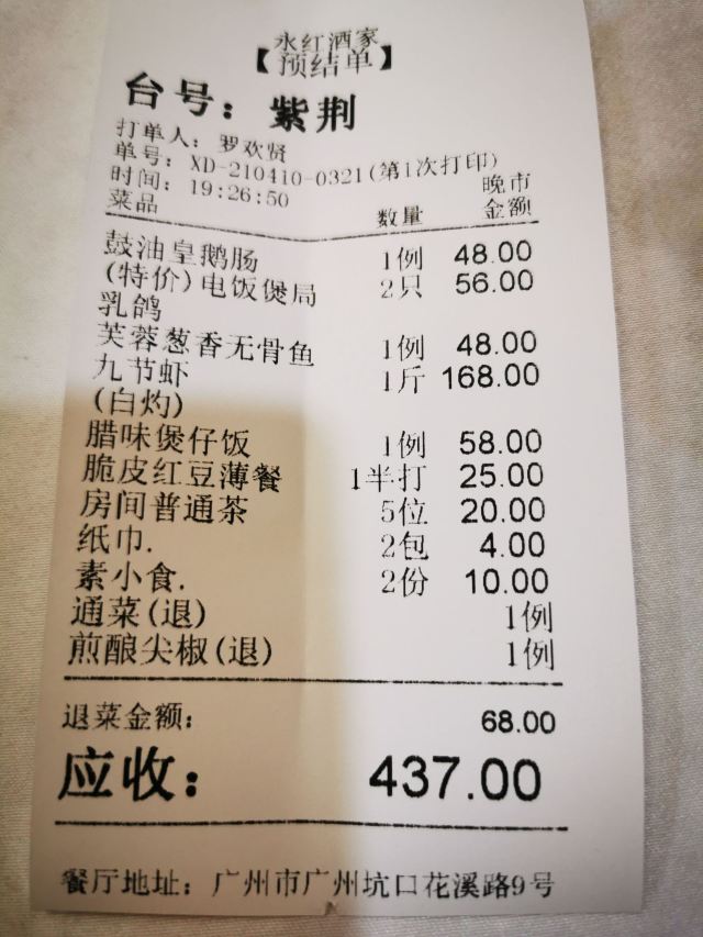 坑口附近的一家超大农庄,室内大厅气派,大棚搭建的外围就有点大排档的感觉,房间挺多的,不过必须消费2包纸巾+2碟小菜总共14元,这个附加还是可以接受的,毕竟房间环境比较舒适 平日每日都有一款特价点心和几款特价菜,限大厅使用 正价菜价格也非常实惠,芳村吃东西就是便宜 清明前后周末过来,用餐的人超多,出菜速度非常慢,不过也可以理解 碟头挺大的,味道还不错,会有下次 Tips:点菜的服务员sale得比较厉害,明明这里碟头很大还不停推荐让多点几个菜,老说不够吃,大家自己看着办啦