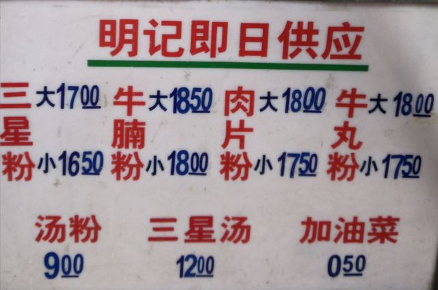 明记就是大名鼎鼎的“屎坑粉”,小小的一家店开在榕树下,居然已经有20多年的历史了。老板大概8点左右开档,一般到中午卖完了就关门,想吃的话得提早去,否则只有“明日请早”的份了。牛腩粉、三星粉是这里的招牌,端上桌后,咋一看上去很不起眼,当你喝下第一口汤时,就会开始对它赞不绝口。牛腩、牛三星新鲜入味,米粉爽口滑溜,百吃不厌。