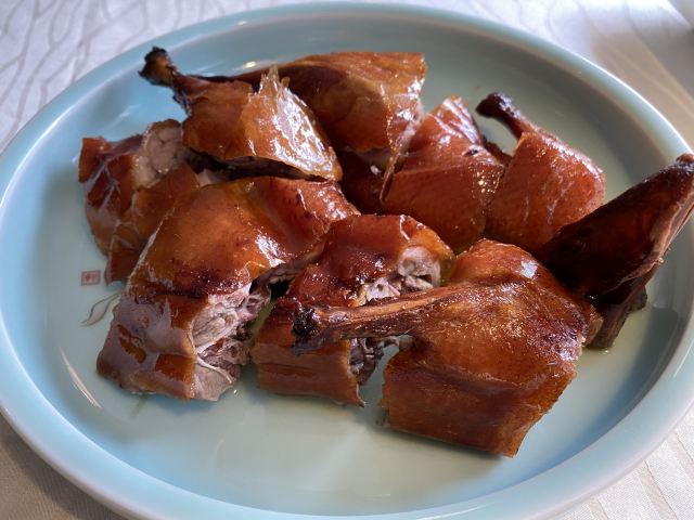 Xin KeJia (FengJiang)团购了这一家客家菜餐厅的一份吊烧鸭仔皇而来到这里,餐厅位于中山二路的新兴酒店楼上,招牌写着的是:客鼎客家料理,和团购标的餐厅名字不一样,幸好是提前看过别人的评论知道是这里,可能餐厅最近改过名字吧。 {吊烧鸭仔皇},团购价是10元,偶然见到有秒杀是8元,餐厅里卖的是9.9元,所以服务员会建议你不需要团购,最后直接付款就好,下单是自助扫码,团购的鸭子也是正常点单,用餐完了到收银台付款时,告诉他们用团购,他们就会减掉9.9元。这只鸭子不大,乳鸭来的,但是要比乳鸽大一半吧,皮烧得很脆,吃起来还有咔咔的声响。烧鸭子很香,腌制得入味,皮脆肉香,骚味肯定会有一些,但是也不会很重。配上一碟泰式酸甜酱,就好像吃脆皮烧鸡那样,味道还可以。 {少爷葱油饼},我再多点了半打葱油饼,饼的个头蛮大的,软软的,味道香甜。 {杭州胎菊茶},点了胎菊茶,服务员说,如果是坐小桌子的客人,每人就是那样子,泡好茶以后,直接拿着玻璃水罐喝,就不另外配茶杯了,如果是大桌子的客人,就是正常的大水壶配一人一个茶杯,拿着个水罐直接喝,好奇怪的做法呀,服务员见我不习惯,就给了我一个茶杯。 这里上菜有点慢,服务员明显不够,只有见到一个服务员和两三个部长在工作,楼面一直在忙。