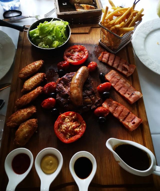 黑椒猪排,法式鸭胸,沉迷巧克力,牛排拼盘,烤蕃茄,鸭胸肉,二人套餐,薯条,甜点,法式香煎鹅肝,奶油南瓜汤,通心粉,火车头特色尼斯沙拉,法国红酒炖鸡,面包,肉眼牛排