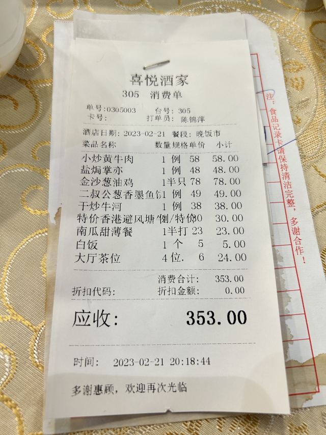 [薄荷]环境: 一进门闻到一股味,客人又不多,有点入坑的感觉 [服务铃]服务: 需要自己到门口位置看图点餐,用餐其间很少服务员路过,买单用了某音代金券,然后整单不给开票! 白切鸡 肉质一般 盐焗掌亦 炸得挺脆,第一次吃这个做法,还不错 干炒牛河 好大一碟,牛肉也不少 避风塘九肚鱼 味道ok,但鱼肉较少 小炒黄牛肉 牛肉和辣椒都很多,辣得可以 二叔公葱香墨鱼饼 金麦南瓜甜薄餐 中规中矩 买单300+,除了环境不够好,吃还算ok