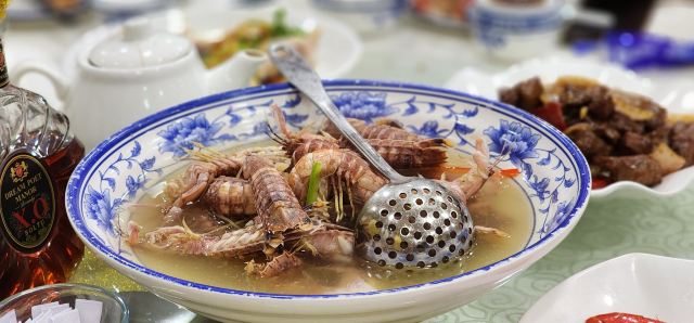 白切雞,葱油饼,烧鹅,果汁猪扒,烧鸡,萝卜糕,五味鹅汁大肠,住家手打肉丸,五柳炸蛋,石窝金瓜海鲜豆腐,三鲜羹汤,蒸鱼卜,九节虾,烤鸡