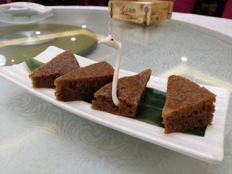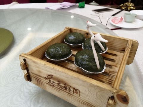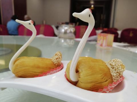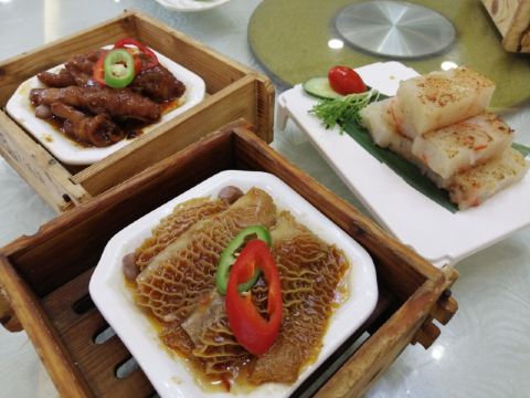 红烧乳鸽,虾饺,金瑶萝卜糕,话梅猪手,杏仁蛋挞,陈皮蒸牛肉丸,金牌一品包,榴莲梳芙里,红焖羊肉煲,红米肠