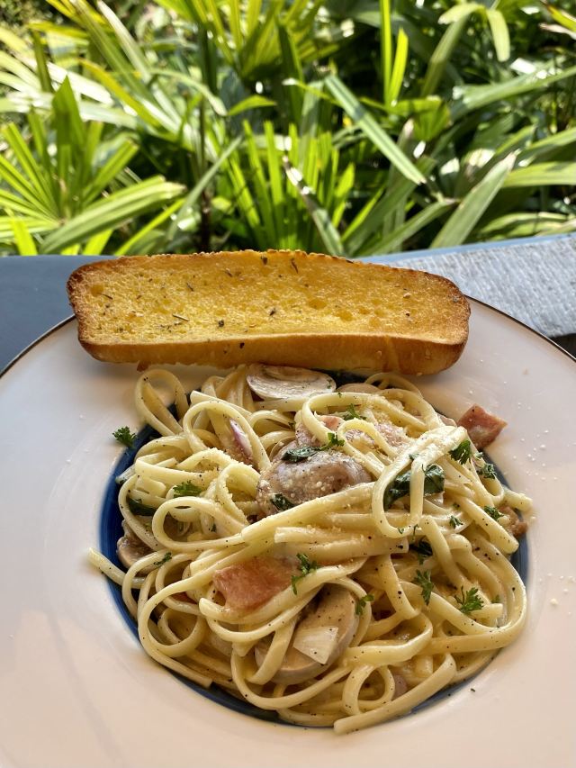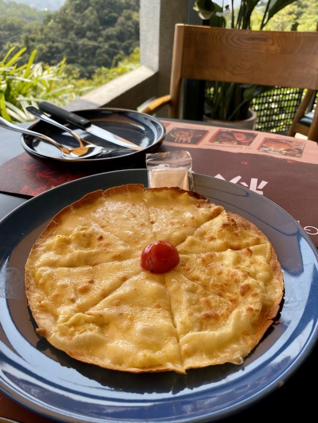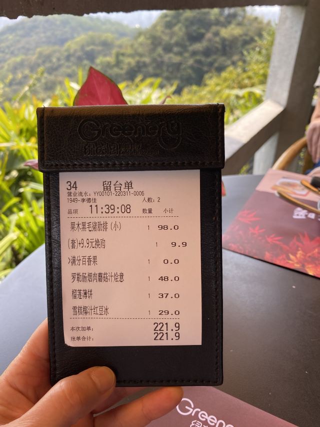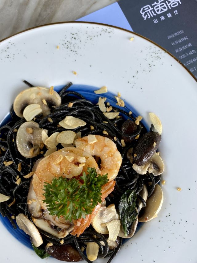 alicezmy在上山的路上搜到了这家位于天南第一峰的绿茵阁,虽然煲贬不一,但鉴于独特的用餐环境还是决定一试。 [薄荷]环境: 绝对要给五星。坐在山顶⛰️如此舒适的环境里,吹着东风惬意地吃着西餐的确是一种比较难得的人生体验。 出品是出乎意料的好。简直让我印象中早已崩塌的绿茵阁形象重新支棱起来了。 果木伊比利亚黑毛猪肋排(98)咬落多汁,外脆里嫩,味道超赞。而且份量十足,两人分享十分满足。 罗勒肠烟肉磨菇汁意粉(48)味道口感都很棒。里面的香肠巨好吃。份量也适中。 榴莲薄饼卖相一般,份量也比较少,但榴莲控肯定会爱不释手。 饮品方面试了两种,雪糕椰汁🥥红豆冰(29),红豆绵软;点烤肋排换购的满分百香果(9.9)口味清新,解腻一流。 [服务铃]服务: 总的来讲很不错。