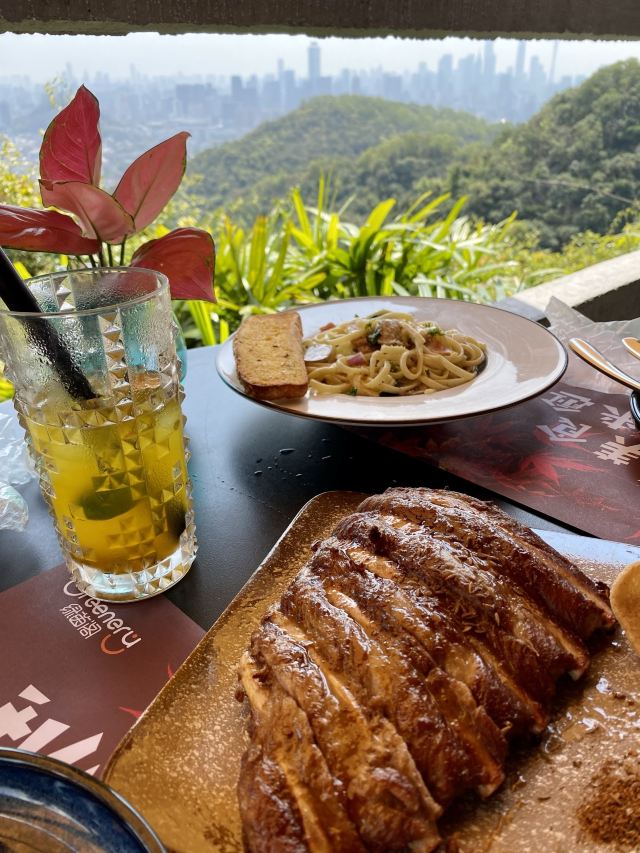 Lvyinge (baiyunshan)在上山的路上搜到了这家位于天南第一峰的绿茵阁,虽然煲贬不一,但鉴于独特的用餐环境还是决定一试。 [薄荷]环境: 绝对要给五星。坐在山顶⛰️如此舒适的环境里,吹着东风惬意地吃着西餐的确是一种比较难得的人生体验。 出品是出乎意料的好。简直让我印象中早已崩塌的绿茵阁形象重新支棱起来了。 果木伊比利亚黑毛猪肋排(98)咬落多汁,外脆里嫩,味道超赞。而且份量十足,两人分享十分满足。 罗勒肠烟肉磨菇汁意粉(48)味道口感都很棒。里面的香肠巨好吃。份量也适中。 榴莲薄饼卖相一般,份量也比较少,但榴莲控肯定会爱不释手。 饮品方面试了两种,雪糕椰汁🥥红豆冰(29),红豆绵软;点烤肋排换购的满分百香果(9.9)口味清新,解腻一流。 [服务铃]服务: 总的来讲很不错。