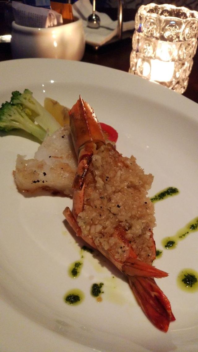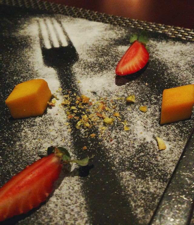 炖猪脑应该是睇三次过来吃了。之前在公众号秒杀了原价299,现价268元的双人晚餐。有位上的沙律,前主菜各2,前主菜居然有蒜蓉虾吃,很好吃,虾肉弹牙新鲜。主菜是一个要7成熟的羊排,一个要5成熟的牛扒,结果,羊排是恰到好处,但牛扒可能比较薄身的关系,黎到都快9成了。因为服务员有问意见,我地都提供了意见,说牛扒有油烟的味道,结果换来水果一碟,最后的图。其实套餐噶食物还是不错的,很喜欢士多卑利的雪芭,很解腻。甜品要了芝士蛋糕,呵呵,很好吃,摆盘又靓。 而且今次还帮我安排了一个角位,刚好90度睇到正佳,同日落,又比较静,很舒服,谢谢安排。有提前订座的。