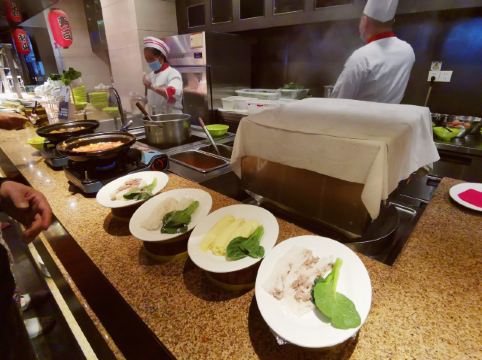 陌染MM周末带家人出来泡温泉度假,选择了住在碧泉空中温泉酒店。选择这家酒店的其中一个原因也是听说了他们的自助餐不错,晚上是西班牙美食节,也有西班牙舞蹈表演。食物的品种很丰富,质量非常不错,例如:烧肉,平时自己在烧腊店也很少买到这么新鲜、脆皮而甘香的五花烧肉,更别说是自助餐了,然而这里的烧肉真是绝,一开始没有服务员看着,客人都是一抓一大把,好吃不要错过。 炖汤也是,我不知道是否每天有不一样,我吃的那天是黑蒜炖肉汁,每天一盅,有这个规定也好,不然这么好的汤浪费了就不太对了。早餐有现做的拉肠,粤式拉肠还是蛮出名的。现滚粥也有四个不同口味,厨师一煮就是一锅子,然后乘出来给客人一小碗,当然不够可以要求添加,我喜欢分量小一点,可以多尝尝别的食品。