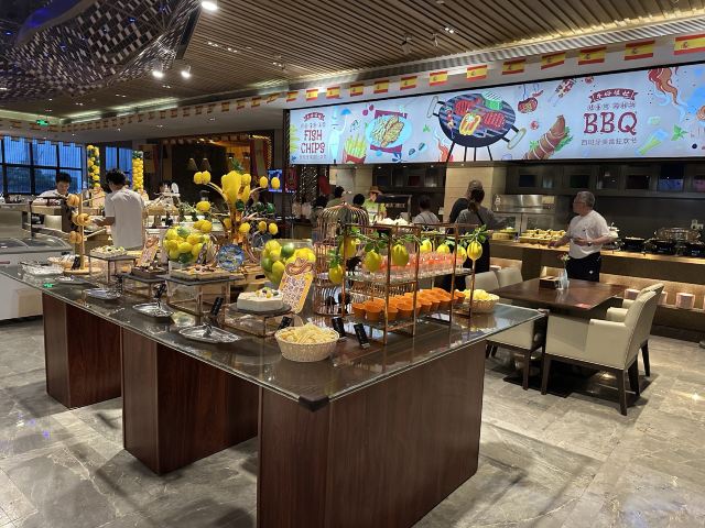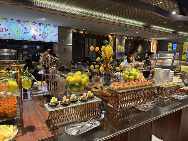三文鱼,自助早餐,海鲜,甜点,法式焦糖炖蛋,墨西哥烤肉,鲜虾,精美水果,蛋挞,花螺
