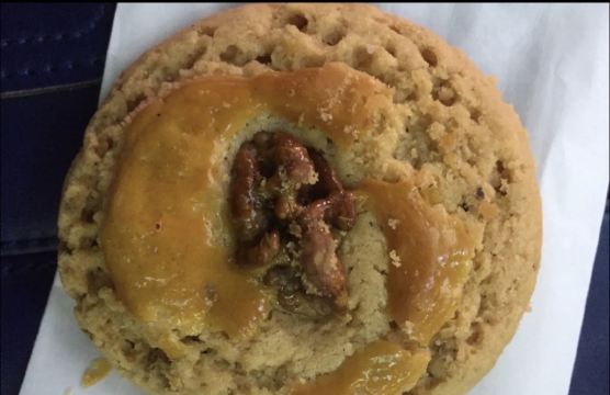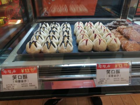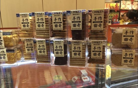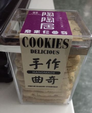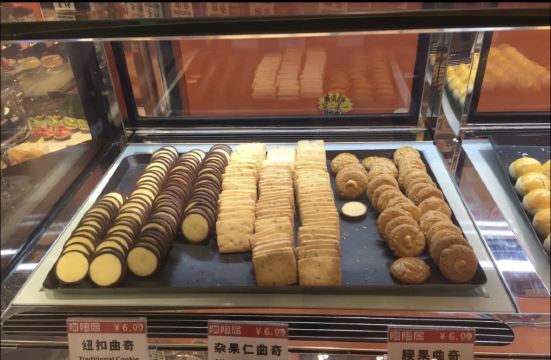 陌染MM参加微信上面的一个点赞活动,赢得了一份曲奇饼,看到它上面只有两天时间领取,而且领取还有规定具体的某两个小时,我马上赶在头一天就去领了。地方很好找,通知上来写了是在大佛寺的对面,刚好我对大佛寺非常了解,来到大佛寺门口,望对面就马上见到。这个门店应该也是新开没有多久,因为以前都没有见到。来到的时候,有一位工作人员在那里负责做登记,派曲奇饼的,他对我说刚好一批饼派完,新饼还要等10分钟打包好就行。当这位工作人员了解到我有车停在附近,怕警察来抄牌,他马上到内屋帮忙赶紧装了一小盒出来,服务好得不要不要。 当时肚子也饿了,见到很多人买东西,我也凑了个热闹,买了一块核桃饼吃,6元一个,大概是手掌左右大吧,其他的不少东西也都是6元一个的样子。核桃饼很新鲜,很香,也非常酥,轻轻咬下去,饼就开了,酥油味很香,上面还有一层薄薄的、金黄色的脆皮,一直咬到中间的核桃很脆。这个饼很好吃。 拿到的那盒曲奇饼有杂果仁的,应该是杏仁或者腰果之类的果仁弄碎了加在里面的,黄油味香浓,由于新鲜,吃起来口感更加酥化,抓在手上,齿甲留香。以后有机会可以再买些其他东西尝尝,看起来老婆饼、各款曲奇和一些广东特产都不错,觉得他们的出品挺好的。