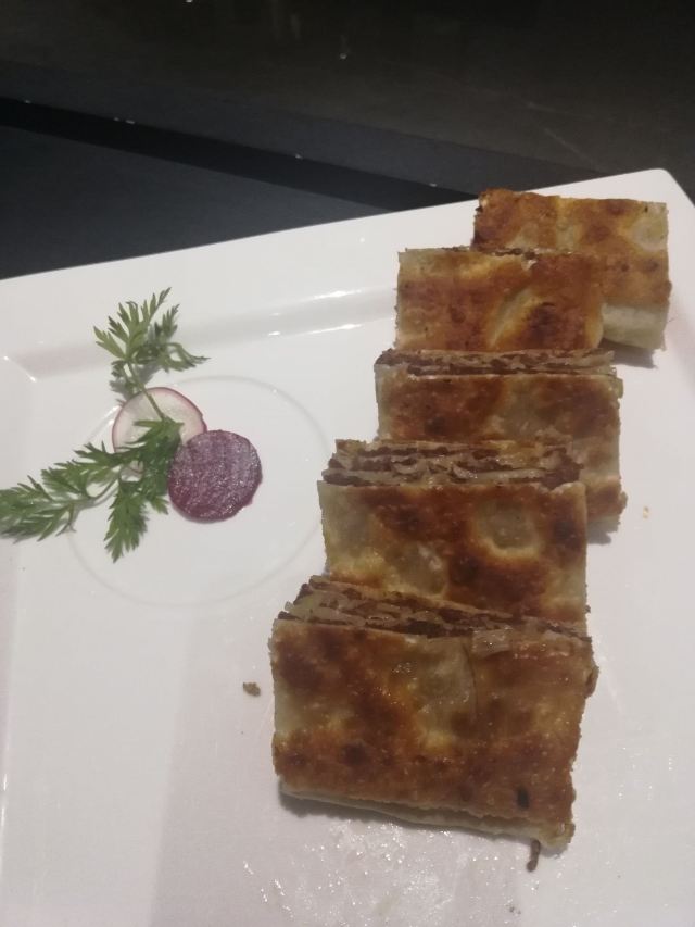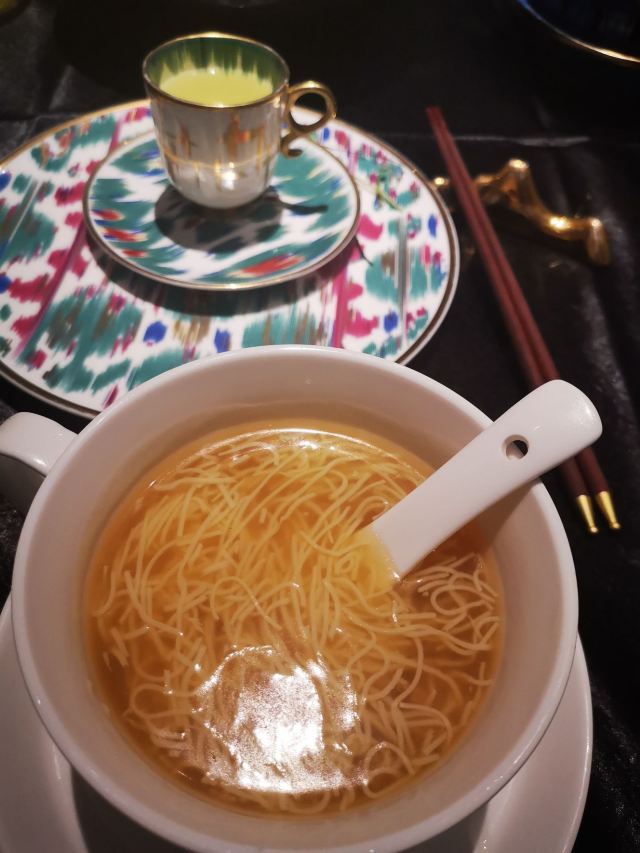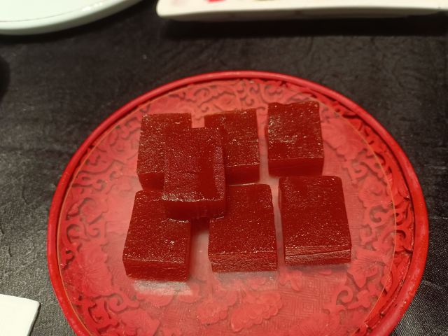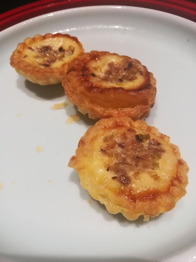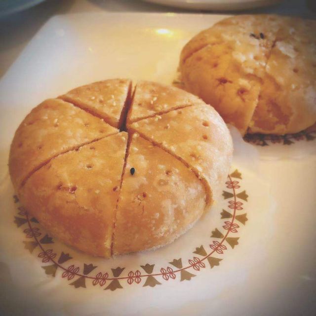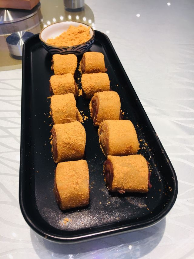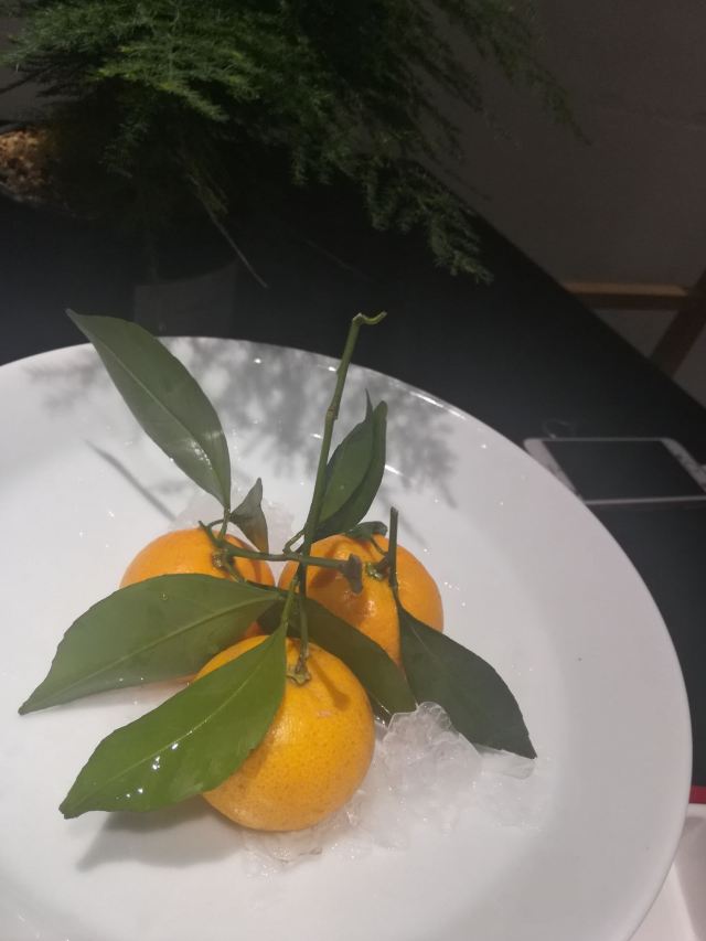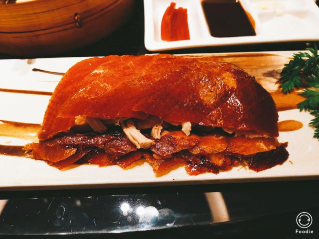 hj****70蛋挞,话系送既,细细3只,口感似葡挞,不过上面铺左d咸咸地碎料,新鲜食皮酥内软滑。 酥香嫩半只,就系烤鸭咯,师傅会推车过来当面切,128半只,切片后就系小小一碟,配酱料或者其它香菜食都几好,但系唔加任何配料净食既话鸭肉就有d苏。 烤鸭小料,一笼薄饼,一碟酱料(青瓜砂糖酸辣酱山楂条甜酱红姜粒咸菜葱白),仲有一盘似沙律菜(四样蔬菜+沙律酱),系烤鸭碟有2束薄荷叶,烤鸭卷饼时加片薄荷叶,口感几清新下。 上汤鸡毛菜,42蚊,咩嘢系鸡毛菜,上台时先知道原来系小白菜,好幼好幼个种,用汤煮,呢个菜最清淡,全部食晒。 酥皮牛肉饼,48蚊6件,主食选左呢个,外面系煎到脆脆既薄面饼,中间夹住牛肉碎,一层面饼一层牛肉碎馅,目测有三层,外脆内香,牛肉味十足,不过就热气d,只食左一件。 水果,送既,就系3只桔仔,但系所有菜式摆盘就极为讲究,所以影相卖相都系靓靓,呢碟水果都加冰黎上。