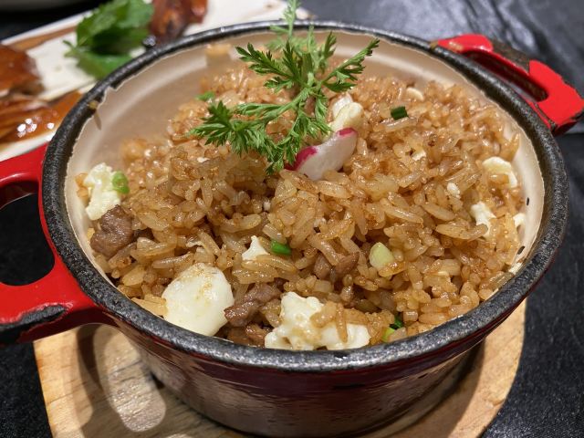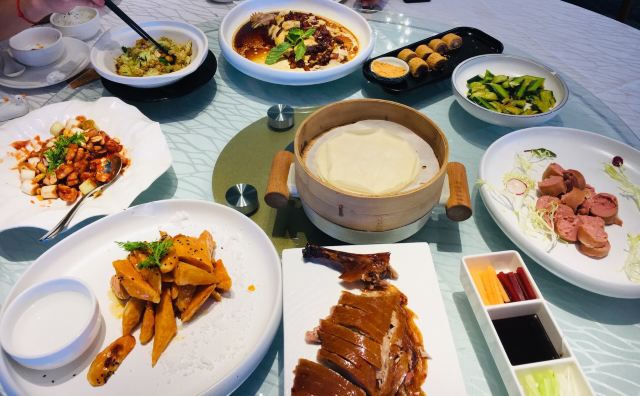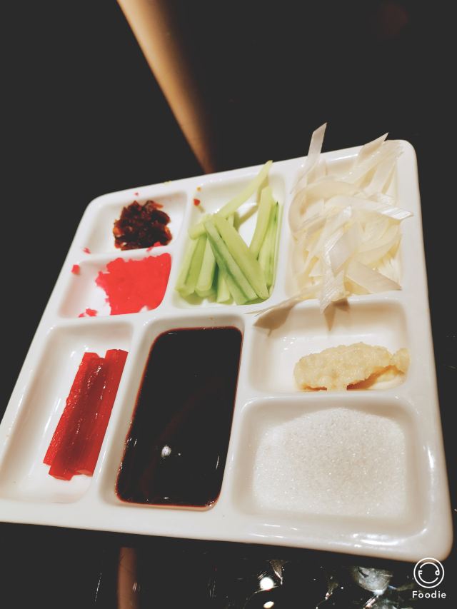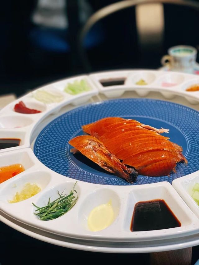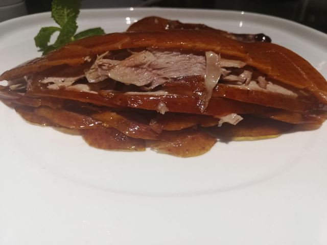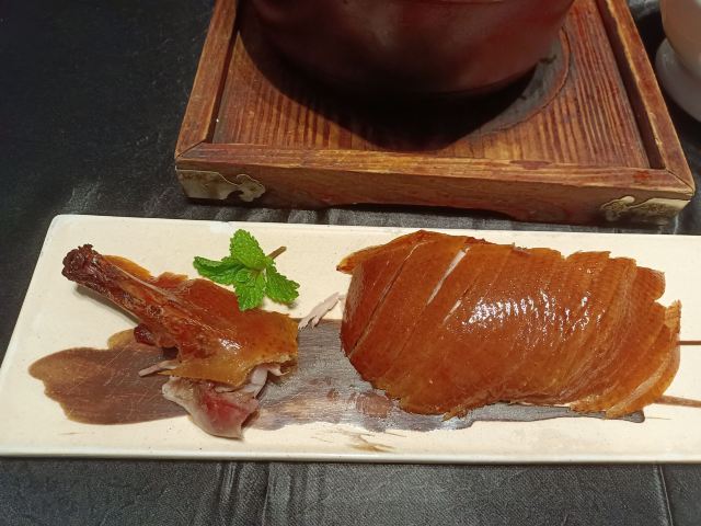 陌染MM抢了一份橙V福利的双人套餐来到这里,建议大家要提前订位,我那天是刚好路过流花路,打电话过去问,餐厅说已经订满了,让我改期,但是我已经来到门口了,幸好餐厅还是临时帮我安排了,用餐过程中,全程都有专人服务,还向我们介绍菜品,甚至连吃烤鸭时的蘸酱也都一一介绍了,服务非常棒。 {烤鸭},来到北京菜餐馆,烤鸭怎么可以少。师傅是直接推着车子,在你桌子旁边现场展示片皮鸭的做法,刀工熟练,很快就可以弄好一份鸭子了。通常一份鸭子大概就是半只的量,当然是去了骨头的,切完了半只,厨师会推回厨房,下一桌客人的鸭子还是完好的一只。鸭子的皮非常脆,不要光吃肉,连皮一起裹在饼皮里,蘸上酱料就可以入口了,好吃。 {手掰豆腐烩牛腩},分量杠杠哒,豆腐像是老豆腐那种,酱汁比较浓,所以豆腐很入味,牛腩煮得很淋,用的是牛腩肉,没有筋的。 {雪花牛肉炒饭},大概是三碗的量,炒饭粒粒分明,挺干身的,放了牛肉粒和蛋白,连我这个平时不喜欢吃饭的人都忍不住尝了一下,炒得可以,但是米饭硬了一点,稍微软一点感觉好些。 {糖醋里脊},盘子好大,其实分量也是很多的,我喜欢吃这道菜,有点酸酸甜甜很好入口,像是广东菜的咕噜肉,但是用的都是全瘦的里脊肉,很嫩,配上一些青豆作装饰,不错。