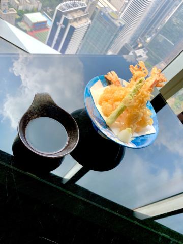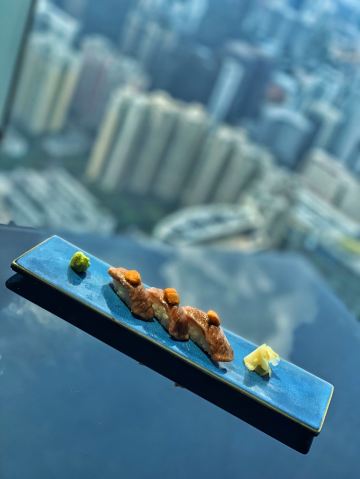KUMOI四季酒店72层的云居(Kumoi),超大的落地窗俯视珠江新城的日与夜,倍感惬意舒怀。 坐在窗边座位,忽然知道了云居名字的由来。 火炙和牛和海胆,巧思妙想把炙和牛的嫩和海胆的鲜完美融合,一啖一件,海胆入口即溶,无需添加其他酱料口感就已经足够饱满。 大虾天妇罗,配备酱料特别调制,吃下去有少少梅子味,减去了天妇罗油炸味,大虾肉质扎实,飞机货果然不同凡响。