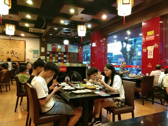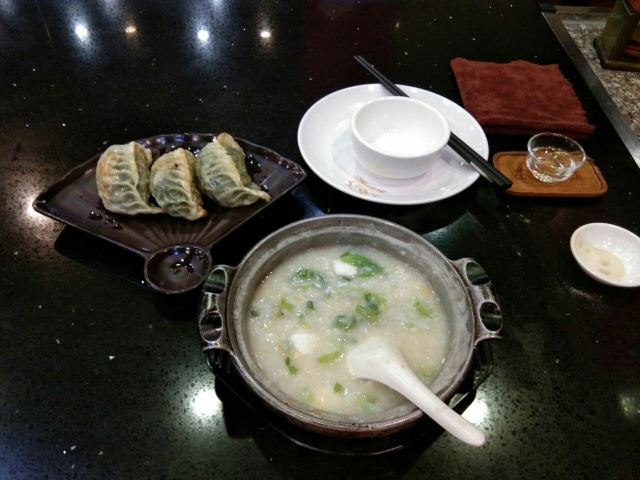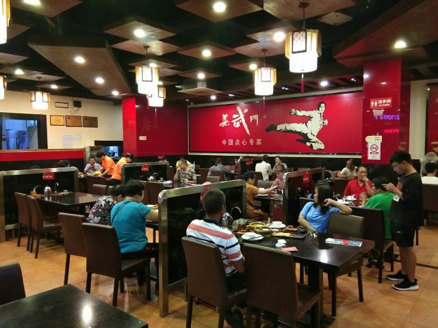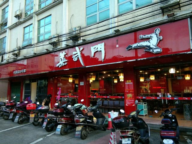蒸武门(增城汽车站附近)――增城老城区实在没啥特别想吃的餐厅,干脆舍远求近就在酒店楼下吃。该店居然沿用高明茶楼的传统,即所谓的免茶位,每张小桌收2元开水费或叫开台费,茶叶一包最低10元,可自带茶叶也挺好。芥菜咸蛋粥9元(料很足)、韭菜煎饺12元(一个足有平常两个),味道都挺不错!23元总好过吃真功夫。